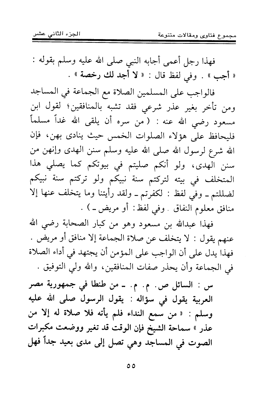 س: السائل ص. م. م. - من طنطا في جمهورية مصر العربية يقول في سؤاله: يقول الرسول صلى الله عليه وسلم: «من سمع النداء فلم يأته فلا صلاة له إلا من عذر (¬1) » سماحة الشيخ فإن الوقت قد تغير ووضعت مكبرات الصوت في المساجد وهي تصل إلى مدى بعيد جدا فهل
