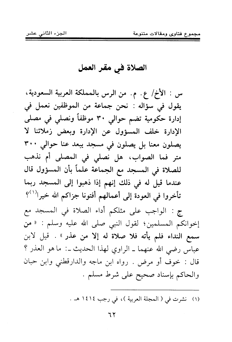 ج: الواجب على مثلكم أداء الصلاة في المسجد مع إخوانكم المسلمين؛ لقول النبي صلى الله عليه وسلم: «من سمع النداء فلم يأته فلا صلاة له إلا من عذر (¬2) » . قيل لابن عباس رضي الله عنهما - الراوي لهذا الحديث -: ما هو العذر؟ قال: خوف أو مرض. رواه ابن ماجه والدارقطني وابن حبان والحاكم بإسناد صحيح على شرط مسلم.