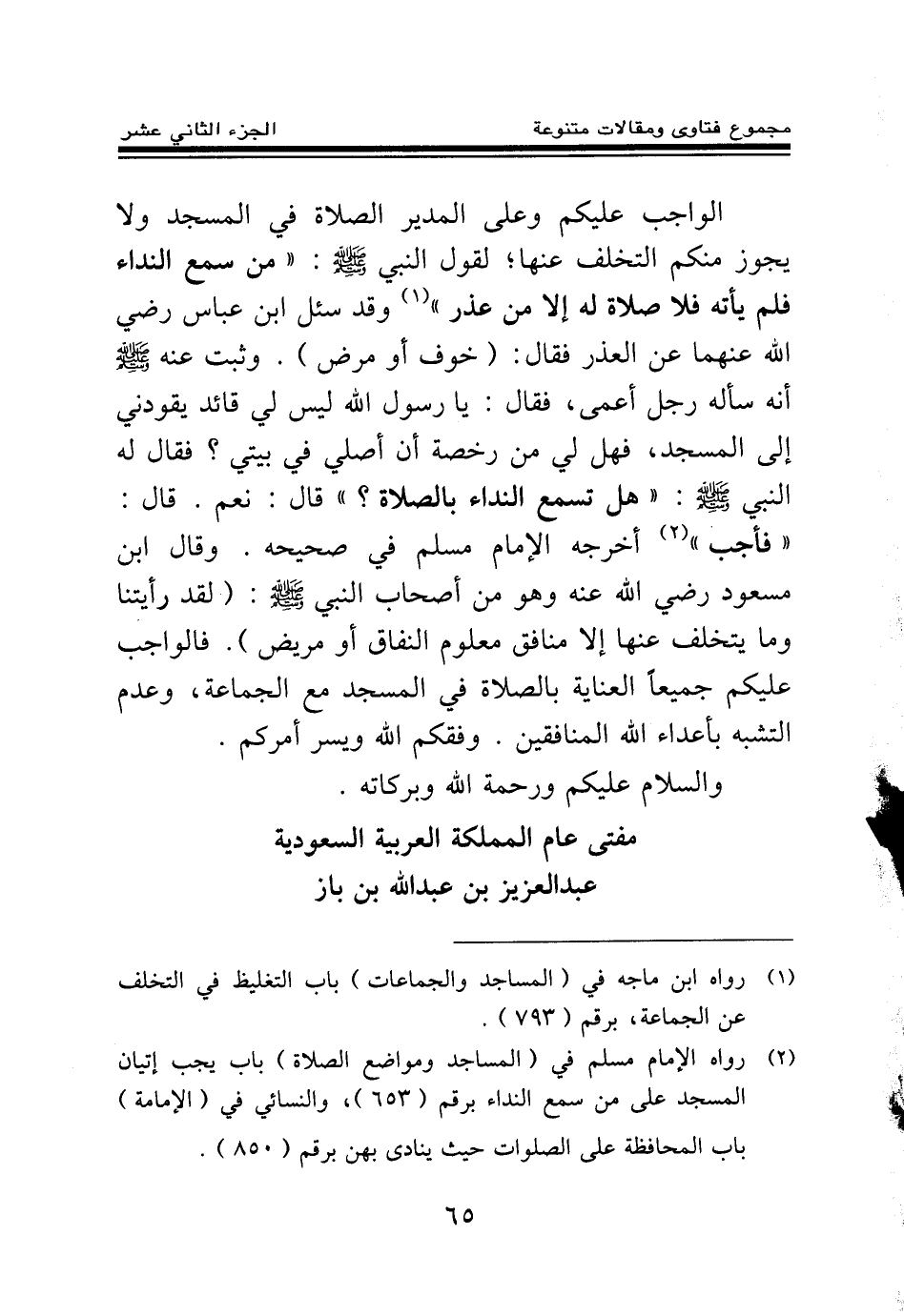 (¬2) رواه مسلم في (المساجد ومواضع الصلاة) باب يجب إتيان المسجد على من سمع النداء برقم (653) ، والنسائي في (الإمامة) باب المحافظة على الصلوات حيث ينادى بهن برقم (850) .