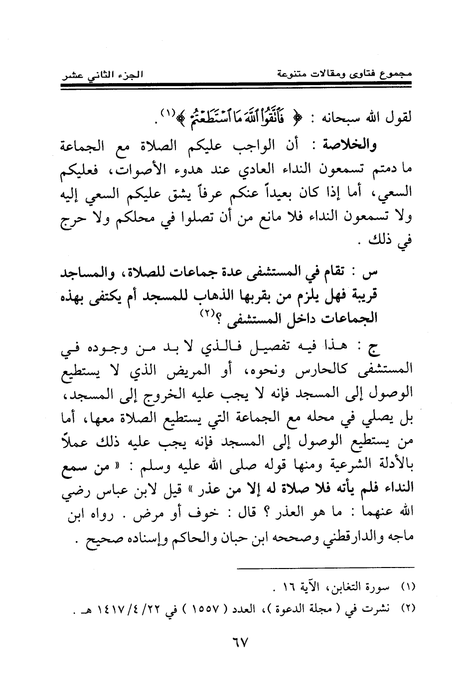 س: تقام في المستشفى عدة جماعات للصلاة، والمساجد قريبة فهل يلزم من بقربها الذهاب للمسجد أم يكتفى بهذه الجماعات داخل المستشفى؟ (¬2)