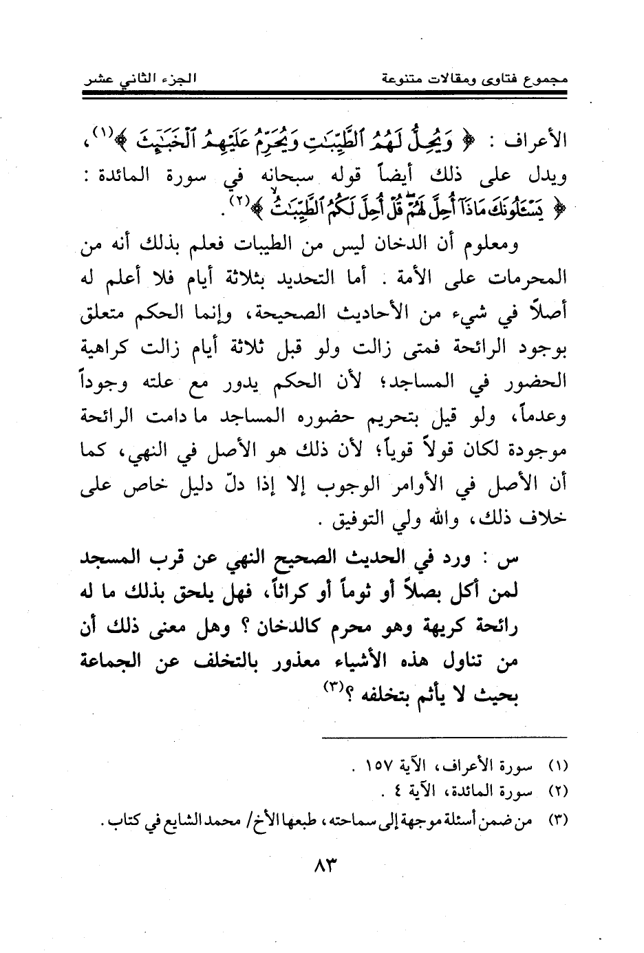 ومعلوم أن الدخان ليس من الطيبات فعلم بذلك أنه من المحرمات على الأمة. أما التحديد بثلاثة أيام فلا أعلم له أصلا في شيء من الأحاديث الصحيحة، وإنما الحكم متعلق بوجود الرائحة فمتى زالت ولو قبل ثلاثة أيام زالت كراهية الحضور في المساجد لأن الحكم يدور مع علته وجودا وعدما، ولو قيل بتحريم حضوره المساجد ما دامت الرائحة موجودة لكان قولا قويا؛ لأن ذلك هو الأصل في النهي، كما أن الأصل في الأوامر الوجوب إلا إذا دل دليل خاص على خلاف ذلك، والله ولي التوفيق.