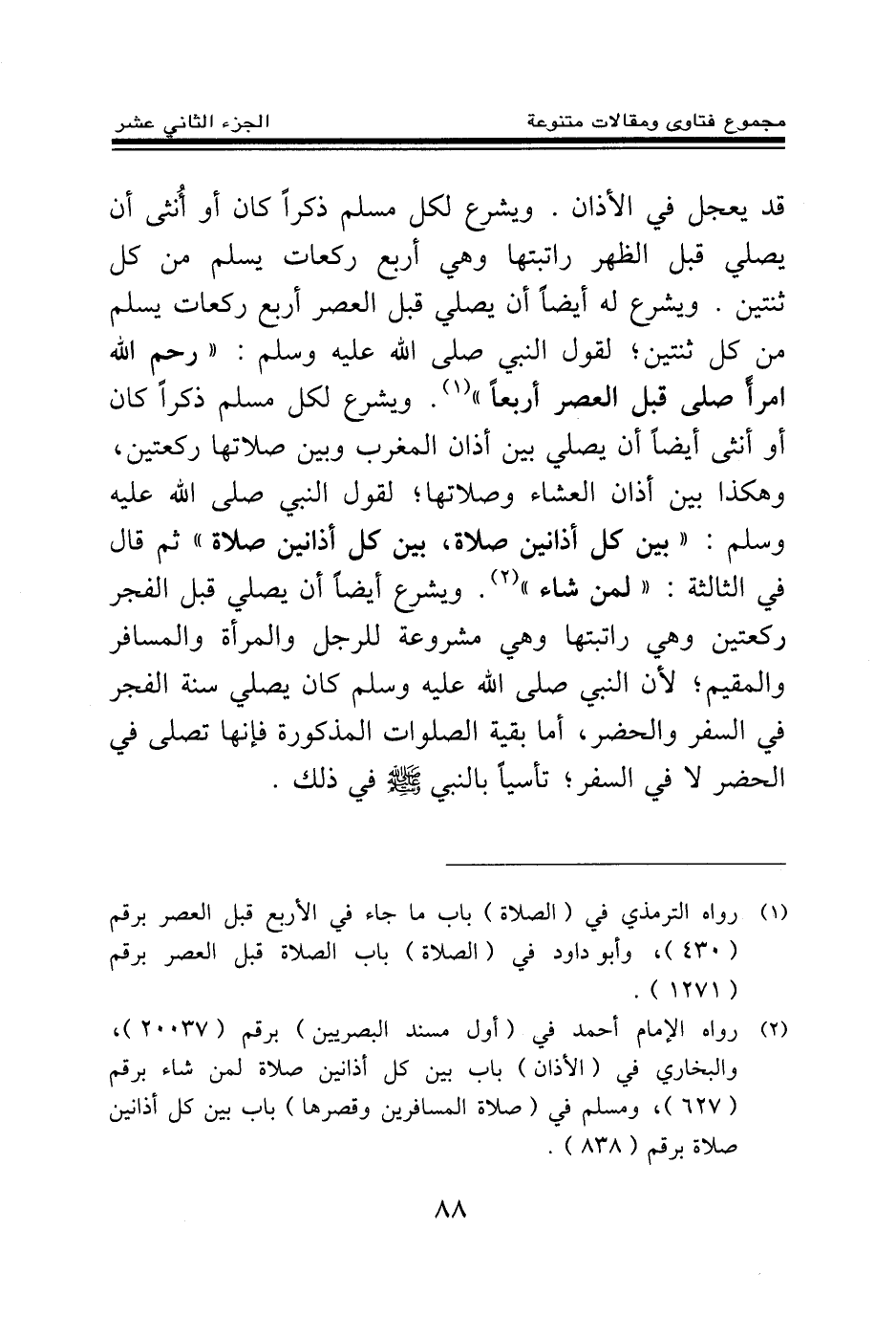 قد يعجل في الأذان. ويشرع لكل مسلم ذكرا كان أو أنثى أن يصلي قبل الظهر راتبتها وهي أربع ركعات يسلم من كل ثنتين. ويشرع له أيضا أن يصلي قبل العصر أربع ركعات يسلم من كل ثنتين؛ لقول النبي صلى الله عليه وسلم: «رحم الله امرأ صلى قبل العصر أربعا (¬1) » . ويشرع لكل مسلم ذكرا كان أو أنثى أيضا أن يصلي بين أذان المغرب وبين صلاتها ركعتين، وهكذا بين أذان العشاء وصلاتها؛ لقول النبي صلى الله عليه وسلم: «بين كل أذانين صلاة بين كل أذانين صلاة، ثم قال في الثالثة: لمن شاء (¬2) » . ويشرع أيضا أن يصلي قبل الفجر ركعتين وهي راتبتها وهي مشروعة للرجل والمرأة والمسافر والمقيم؛ لأن النبي صلى الله عليه وسلم كان يصلي سنة الفجر في السفر والحضر، أما بقية الصلوات المذكورة فإنها تصلى في الحضر لا في السفر، تأسيا بالنبي صلى الله عليه وسلم في ذلك.