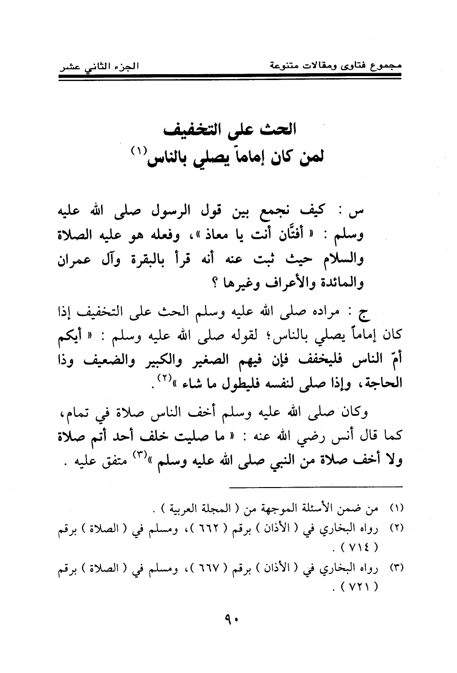 س: كيف نجمع بين قول الرسول صلى الله عليه وسلم: «أفتان أنت يا معاذ (¬2) » وفعله هو عليه الصلاة والسلام حيث ثبت عنه أنه قرأ بالبقرة وآل عمران والمائدة والأعراف وغيرها؟