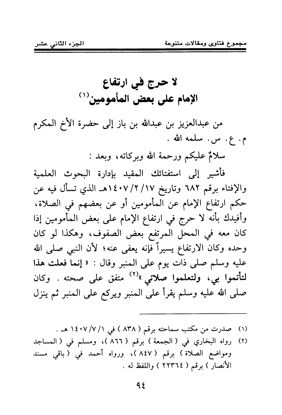 فأشير إلى استفتائك المقيد بإدارة البحوث العلمية والإفتاء برقم 682 وتاريخ 17 \ 2 \ 1457 هـ الذي تسأل فيه عن حكم ارتفاع الإمام عن المأمومين أو عن بعضهم في الصلاة، وأفيدك بأنه لا حرج في ارتفاع الإمام على بعض المأمومين إذا كان معه في المحل المرتفع بعض الصفوف، وهكذا لو كان وحده وكان الارتفاع يسيرا فإنه يعفى عنه؛ لأن «النبي صلى الله عليه وسلم صلى ذات يوم على المنبر وقال إنما فعلت هذا لتأتموا بي ولتعلموا صلاتي (¬2) » متفق على صحته.
