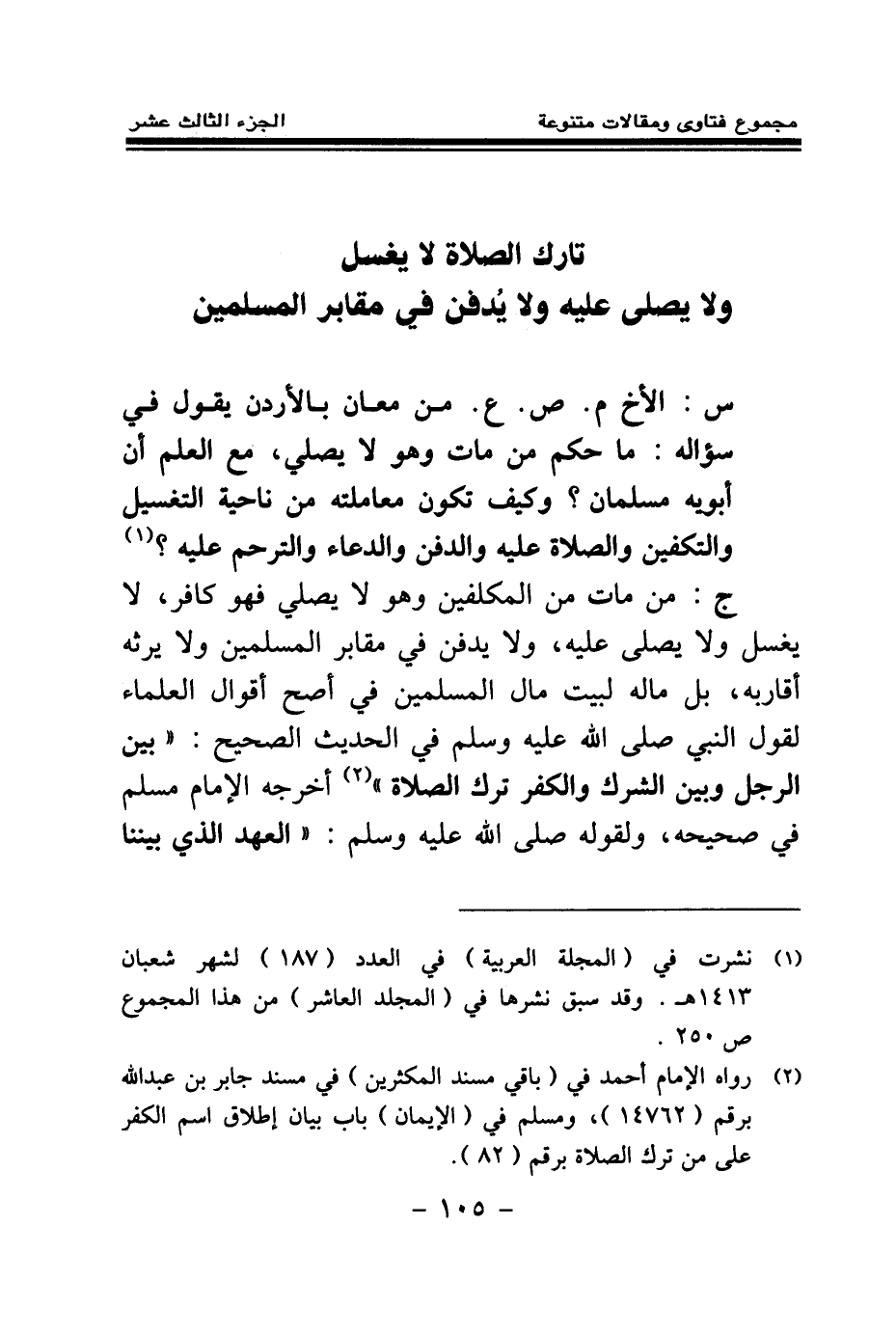 (¬1) رواه الإمام أحمد في (باقي مسند المكثرين) في مسند جابر بن عبد الله برقم (14762) ، ومسلم في (الإيمان) باب بيان إطلاق اسم الكفر على من ترك الصلاة برقم (82) .
