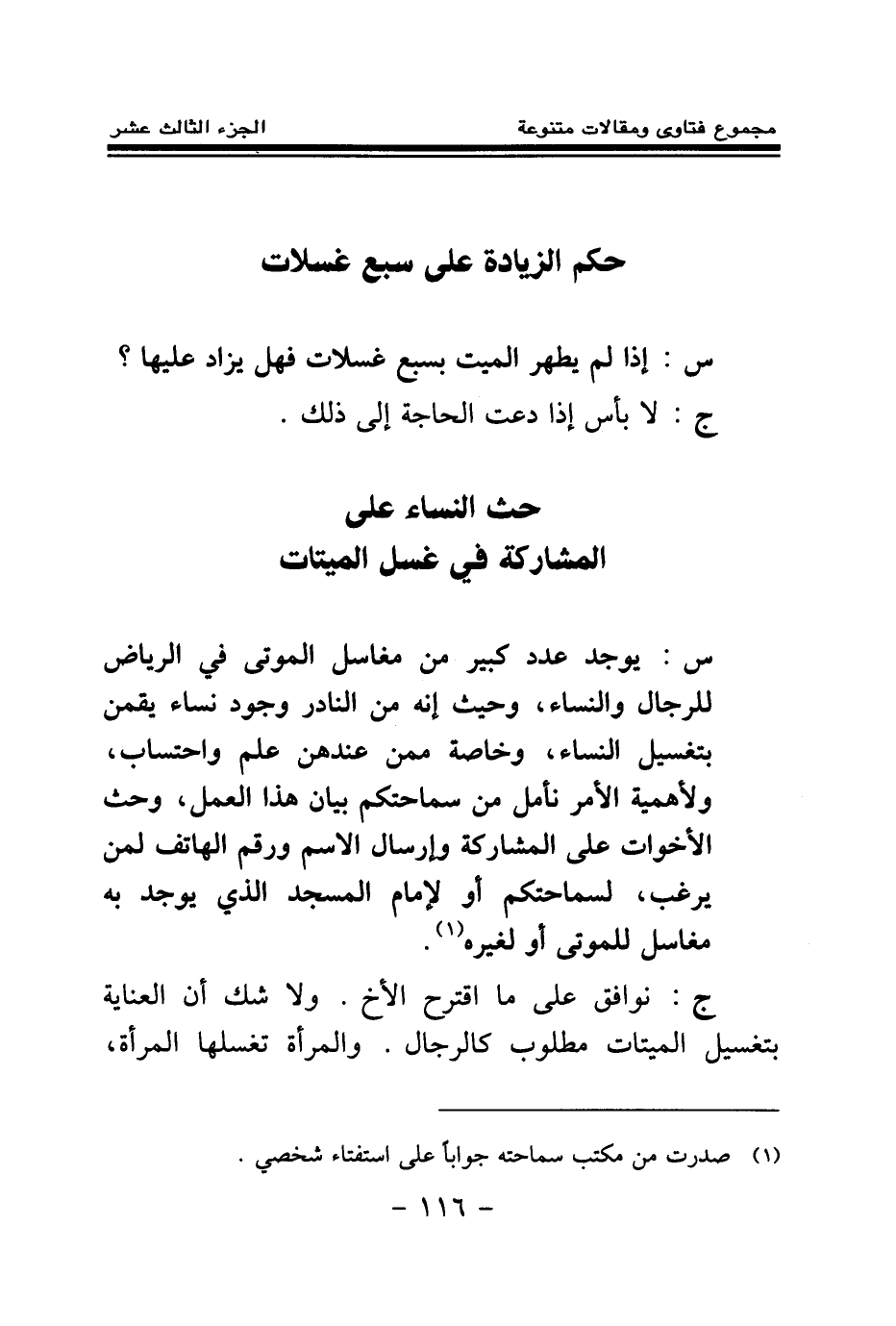 س: يوجد عدد كبير من مغاسل الموتى في الرياض للرجال والنساء، وحيث إنه من النادر وجود نساء يقمن بتغسيل النساء، وخاصة ممن عندهن علم واحتساب، ولأهمية الأمر نأمل من سماحتكم بيان هذا العمل، وحث الأخوات على المشاركة وإرسال الاسم ورقم الهاتف لمن يرغب لسماحتكم أو لإمام المسجد الذي يوجد به مغاسل للموتى أو لغيره. (¬1) .