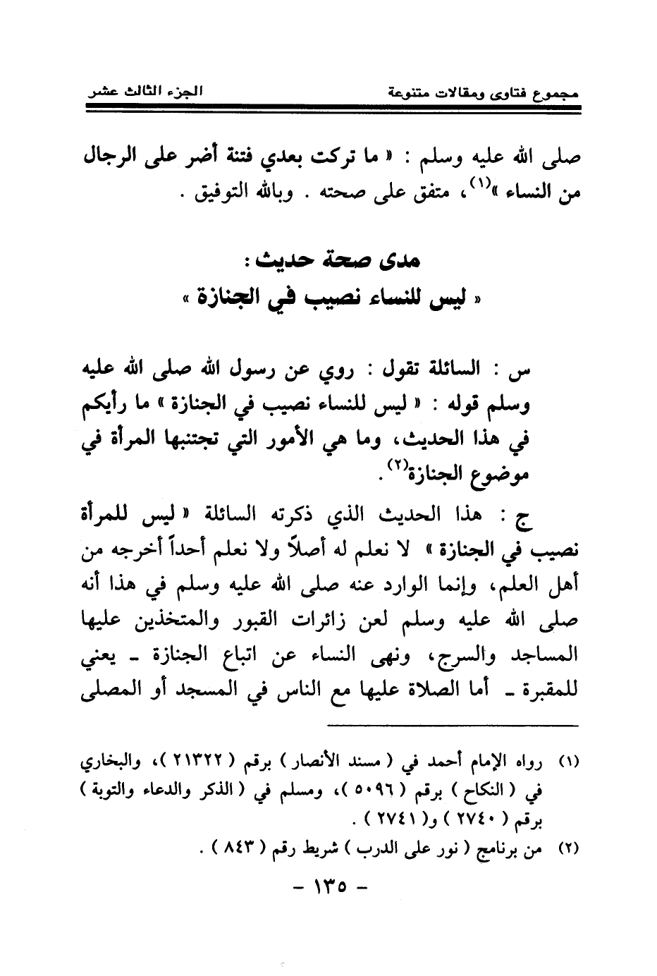 ج: هذا الحديث الذي ذكرته السائلة «ليس للمرأة نصيب في الجنازة» لا نعلم له أصلا، ولا نعلم أحدا أخرجه من أهل العلم، وإنما الوارد عنه صلى الله عليه وسلم في هذا أنه صلى الله عليه وسلم «لعن زائرات القبور والمتخذين عليها المساجد والسرج» ، ونهى النساء عن اتباع الجنازة - يعني للمقبرة - أما الصلاة عليها مع الناس في المسجد أو المصلى