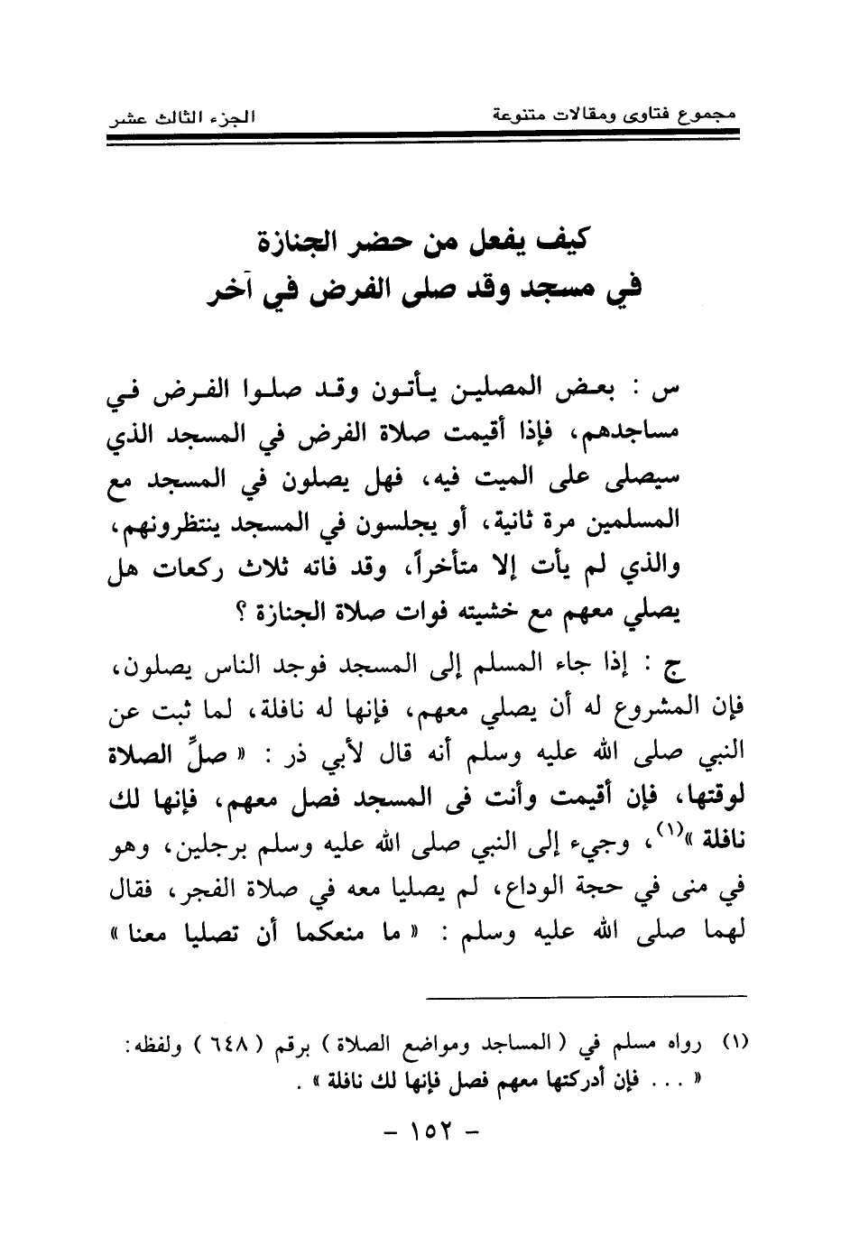 ج: إذا جاء المسلم إلى المسجد فوجد الناس يصلون، فإن المشروع له أن يصلي معهم، فإنها له نافلة، لما ثبت عن النبي صلى الله عليه وسلم أنه قال لأبي ذر: «صل الصلاة لوقتها فإن أقيمت وأنت في المسجد فصل معهم فإنها لك نافلة (¬1) » ، «وجيء إلى النبي صلى الله عليه وسلم برجلين، وهو في منى في حجة الوداع، لم يصليا معه في صلاة الفجر، فقال لهما صلى الله عليه وسلم: "ما منعكما أن تصليا معنا"