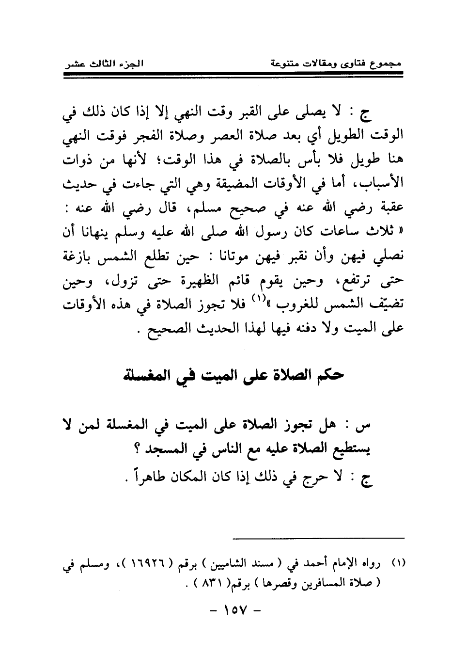 ج: لا يصلى على القبر وقت النهي إلا إذا كان ذلك في الوقت الطويل أي بعد صلاة العصر وصلاة الفجر فوقت النهي هنا طويل فلا بأس بالصلاة في هذا الوقت؛ لأنها من ذوات الأسباب، أما في الأوقات المضيقة وهي التي جاءت في حديث عقبة رضي الله عنه في صحيح مسلم، قال رضي الله عنه: «ثلاث ساعات كان رسول الله صلى الله عليه وسلم ينهانا أن نصلي فيهن، وأن نقبر فيهن موتانا حين تطلع الشمس بازغة حتى ترتفع وحين يقوم قائم الظهيرة حتى تزول وحين تضيف الشمس للغروب (¬1) » ، فلا تجوز الصلاة في هذه الأوقات على الميت ولا دفنه فيها لهذا الحديث الصحيح.