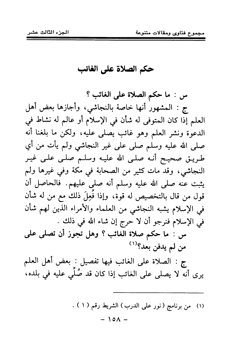 ج: المشهور أنها خاصة بالنجاشي، وأجازها بعض أهل العلم إذا كان المتوفى له شأن في الإسلام أو عالم له نشاط في الدعوة ونشر العلم وهو غائب يصلى عليه، ولكن ما بلغنا أنه صلى الله عليه وسلم صلى على غير النجاشي ولم يأت من أي طريق صحيح أنه صلى الله عليه وسلم صلى على غير النجاشي، وقد مات كثير من الصحابة في مكة وفي غيرها، ولم يثبت عنه صلى الله عليه وسلم أنه صلى عليهم.