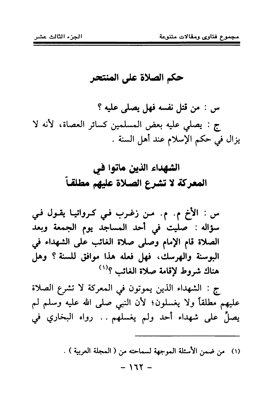 ج: الشهداء الذين يموتون في المعركة لا تشرع الصلاة عليهم مطلقا ولا يغسلون؛ لأن «النبي صلى الله عليه وسلم لم يصل على شهداء أحد، ولم يغسلهم (¬2) » . . . رواه البخاري في