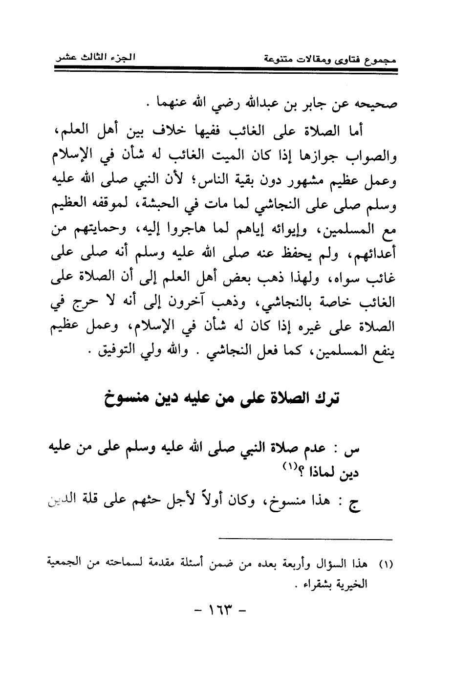 أما الصلاة على الغائب ففيها خلاف بين أهل العلم، والصواب جوازها إذا كان الميت الغائب له شأن في الإسلام وعمل عظيم مشهور دون بقية الناس؛ لأن النبي صلى الله عليه وسلم صلى على النجاشي لما مات في الحبشة، لموقفه العظيم مع المسلمين، وإيوائه إياهم لما هاجروا إليه، وحمايتهم من أعدائهم، ولم يحفظ عنه صلى الله عليه وسلم أنه صلى على غائب سواه، ولهذا ذهب بعض أهل العلم إلى أن الصلاة على الغائب خاصة بالنجاشي، وذهب آخرون إلى أنه لا حرج في الصلاة على غيره إذا كان له شأن في الإسلام، وعمل عظيم ينفع المسلمين، كما فعل النجاشي، والله ولي التوفيق.