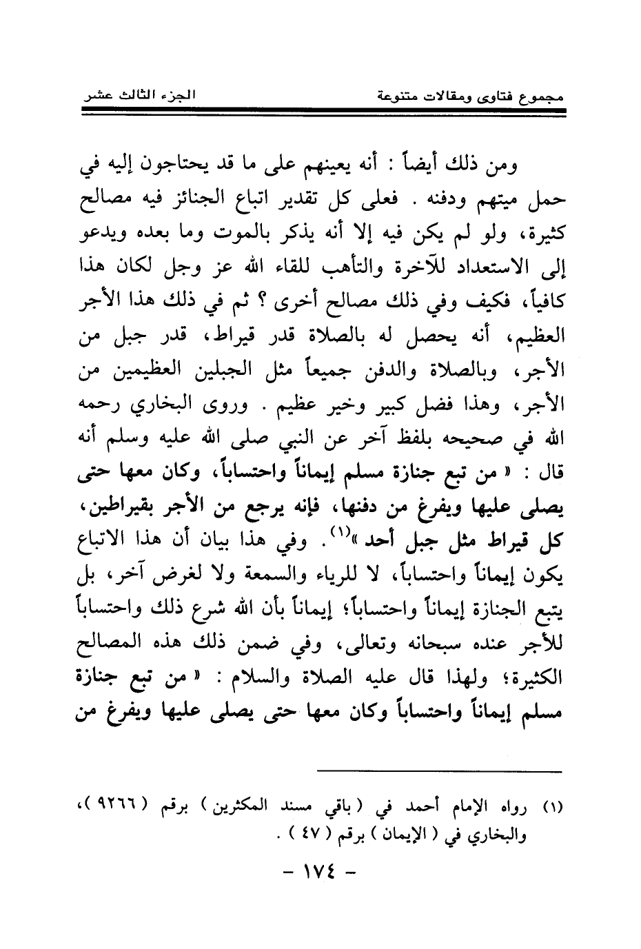 وروى البخاري رحمه الله في صحيحه بلفظ آخر عن النبي صلى الله عليه وسلم أنه قال: «من تبع جنازة مسلم إيمانا واحتسابا وكان معها حتى يصلى عليها، ويفرغ من دفنها فإنه يرجع من الأجر بقيراطين كل قيراط مثل جبل أحد (¬1) » ، وفي هذا بيان أن هذا الاتباع يكون إيمانا واحتسابا، لا للرياء والسمعة ولا لغرض آخر، بل يتبع الجنازة إيمانا واحتسابا إيمانا بأن الله شرع ذلك، واحتسابا للأجر عنده سبحانه وتعالى، وفي ضمن ذلك هذه المصالح الكثيرة؛ ولهذا قال عليه الصلاة والسلام: «من تبع جنازة مسلم إيمانا واحتسابا وكان معها حتى يصلى عليها ويفرغ من