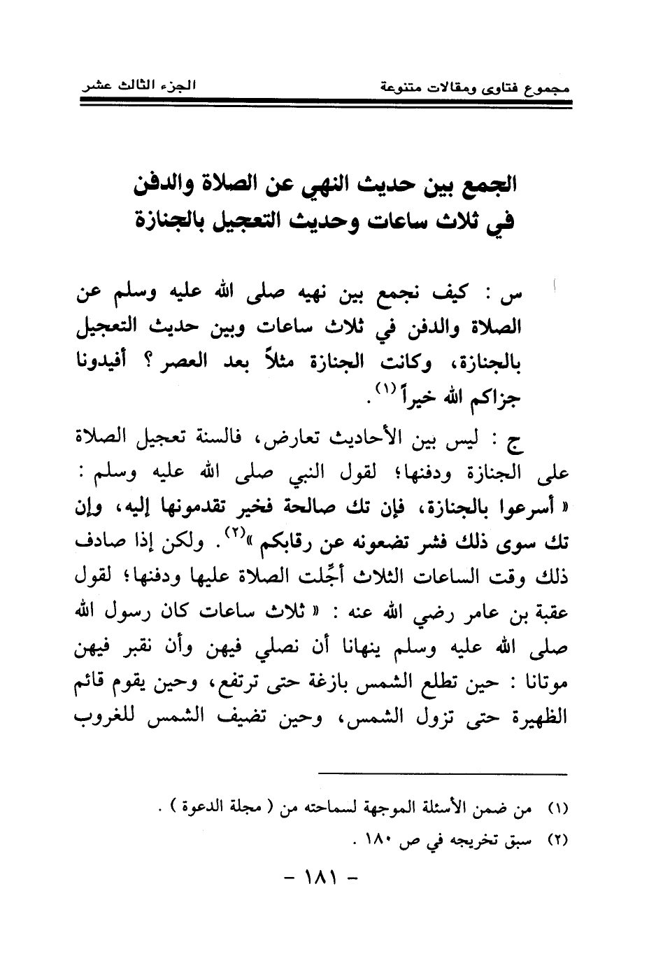 ج: ليس بين الأحاديث تعارض، فالسنة تعجيل الصلاة على الجنازة ودفنها؛ لقول النبي صلى الله عليه وسلم: «أسرعوا بالجنازة فإن تك صالحة فخير تقدمونها إليه وإن تك سوى ذلك فشر تضعونه عن رقابكم (¬2) » ، ولكن إذا صادف ذلك وقت الساعات الثلاث أجلت الصلاة عليها ودفنها لقول عقبة بن عامر رضي الله عنه: «ثلاث ساعات كان رسول الله صلى الله عليه وسلم ينهانا أن نصلي فيهن، وأن نقبر فيهن موتانا حين تطلع الشمس بازغة حتى ترتفع وحين يقوم قائم الظهيرة حتى تزول الشمس وحين تضيف الشمس للغروب