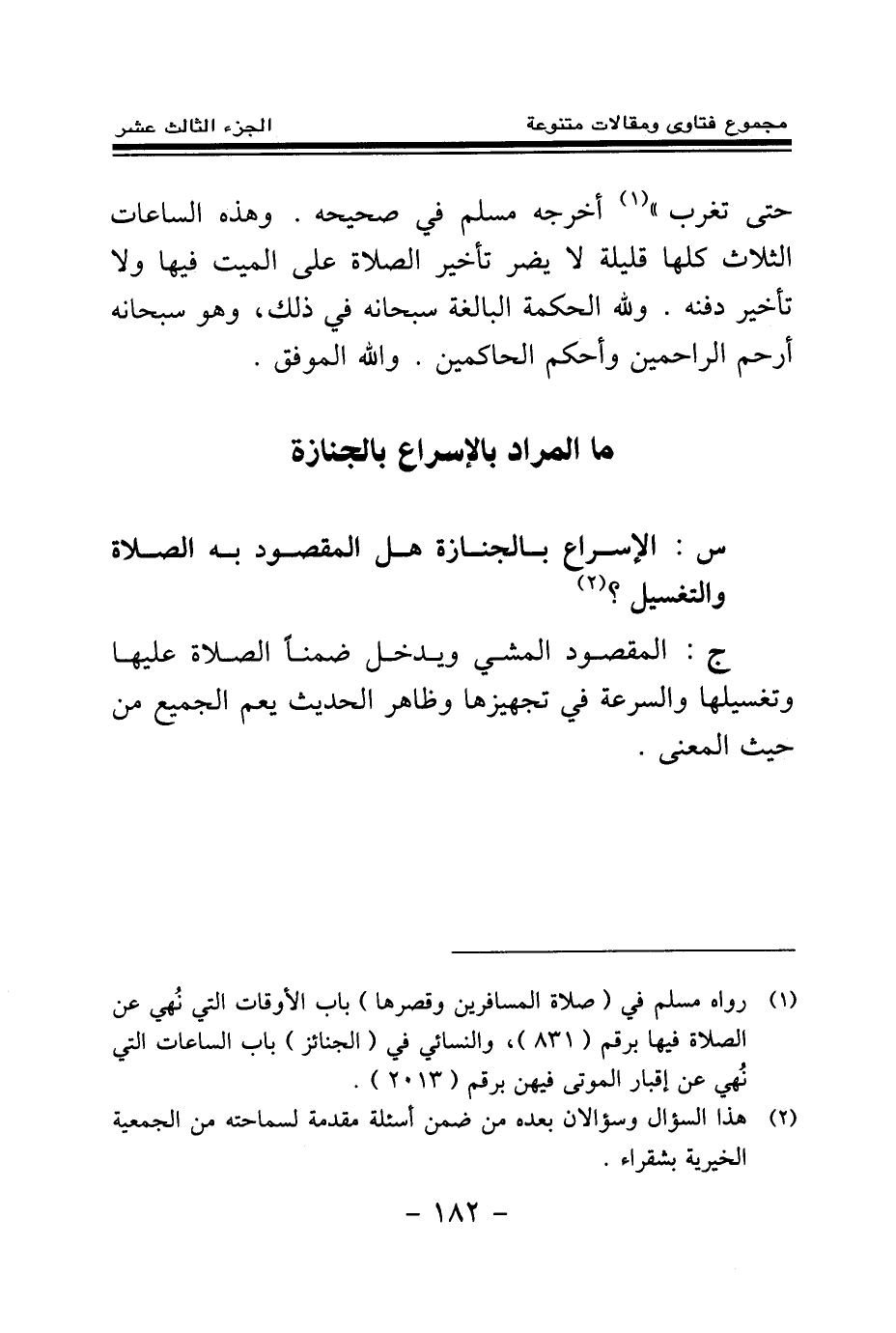 حتى تغرب (¬1) » أخرجه مسلم في صحيحه، وهذه الساعات الثلاث كلها قليلة لا يضر تأخير الصلاة على الميت فيها ولا تأخير دفنه، ولله الحكمة البالغة سبحانه في ذلك، وهو سبحانه أرحم الراحمين وأحكم الحاكمين، والله الموفق.