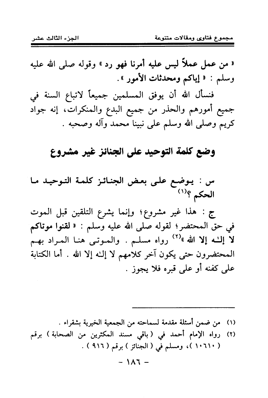 «من عمل عملا ليس عليه أمرنا فهو رد (¬1) » ، وقوله صلى الله عليه وسلم: «إياكم ومحدثات الأمور (¬2) » . فنسأل الله أن يوفق المسلمين جميعا لاتباع السنة في جميع أمورهم والحذر من جميع البدع والمنكرات، إنه جواد كريم وصلى الله وسلم على نبينا محمد وآله وصحبه.