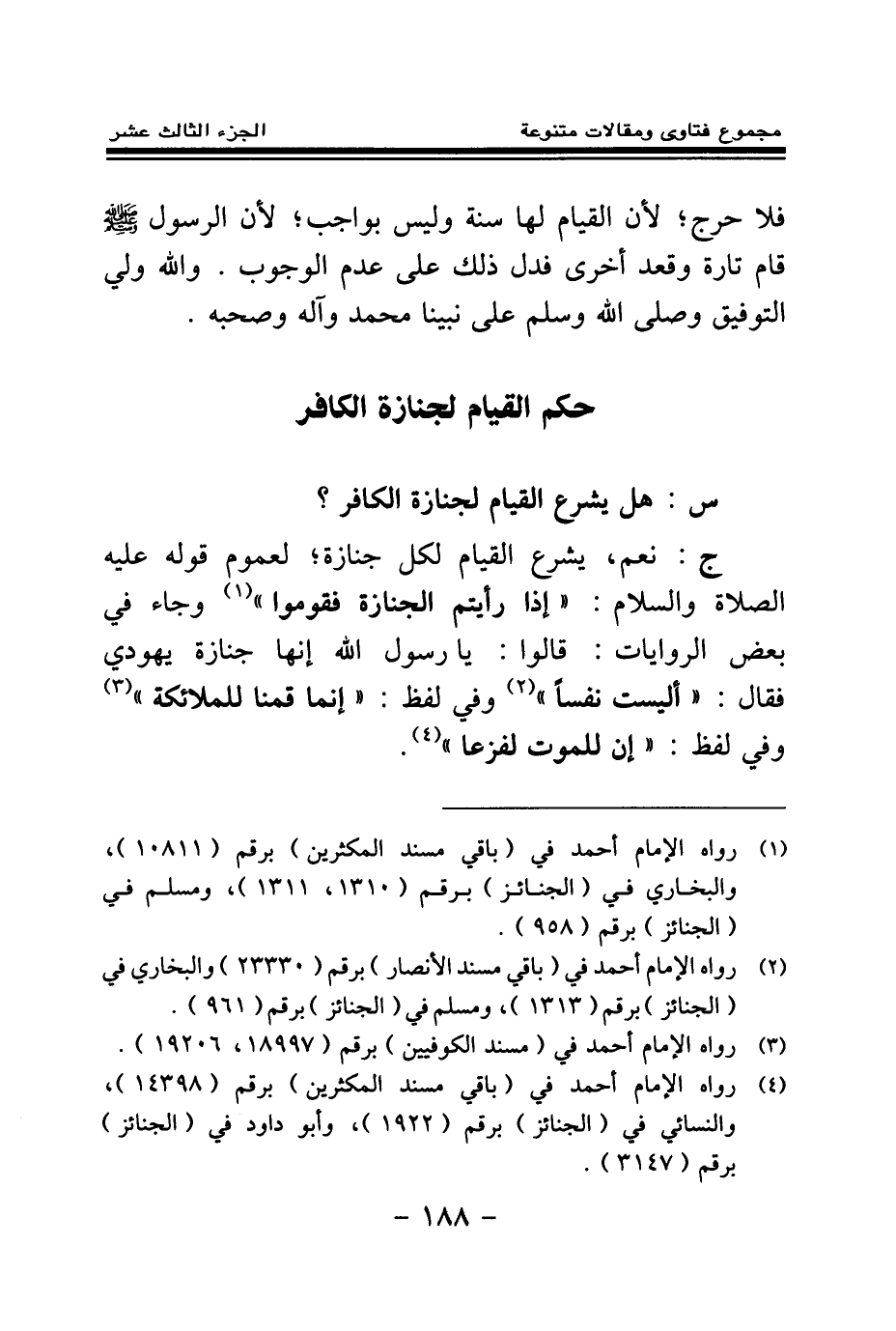 ج: نعم، يشرع القيام لكل جنازة لعموم قوله عليه الصلاة والسلام: «إذا رأيتم الجنازة فقوموا (¬1) » ، وجاء في بعض الروايات: «قالوا: يا رسول الله إنها جنازة يهودي فقال: أليست نفسا (¬2) » ، وفي لفظ: «إنما قمنا للملائكة (¬3) » ، وفي لفظ: «إن للموت لفزعا» .