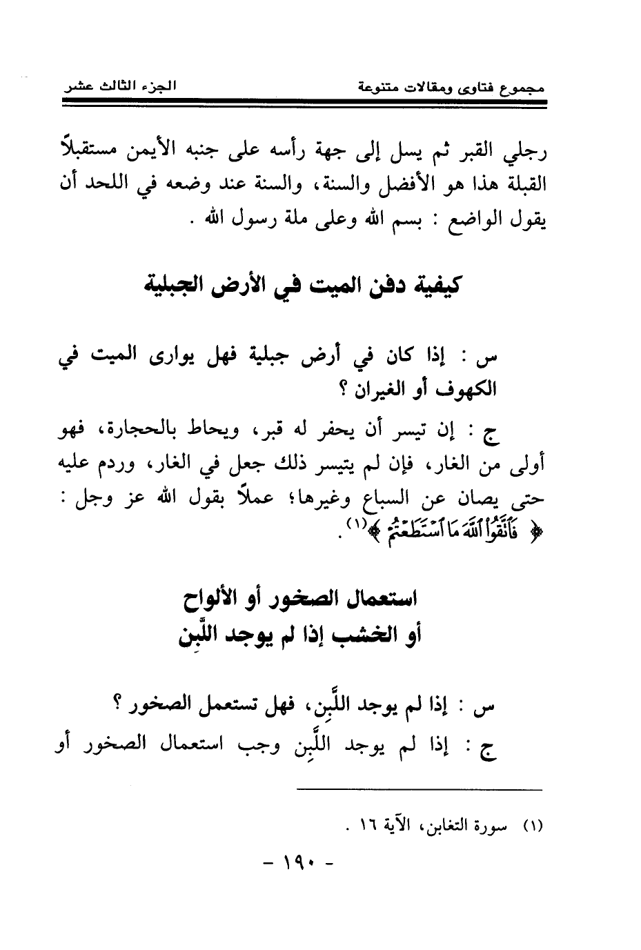 ج: إن تيسر أن يحفر له قبر، ويحاط بالحجارة، فهو أولى من الغار، فإن لم يتيسر ذلك جعل في الغار، وردم عليه حتى يصان عن السباع وغيرها عملا بقول الله عز وجل: {فَاتَّقُوا اللَّهَ مَا اسْتَطَعْتُمْ} (¬1) .