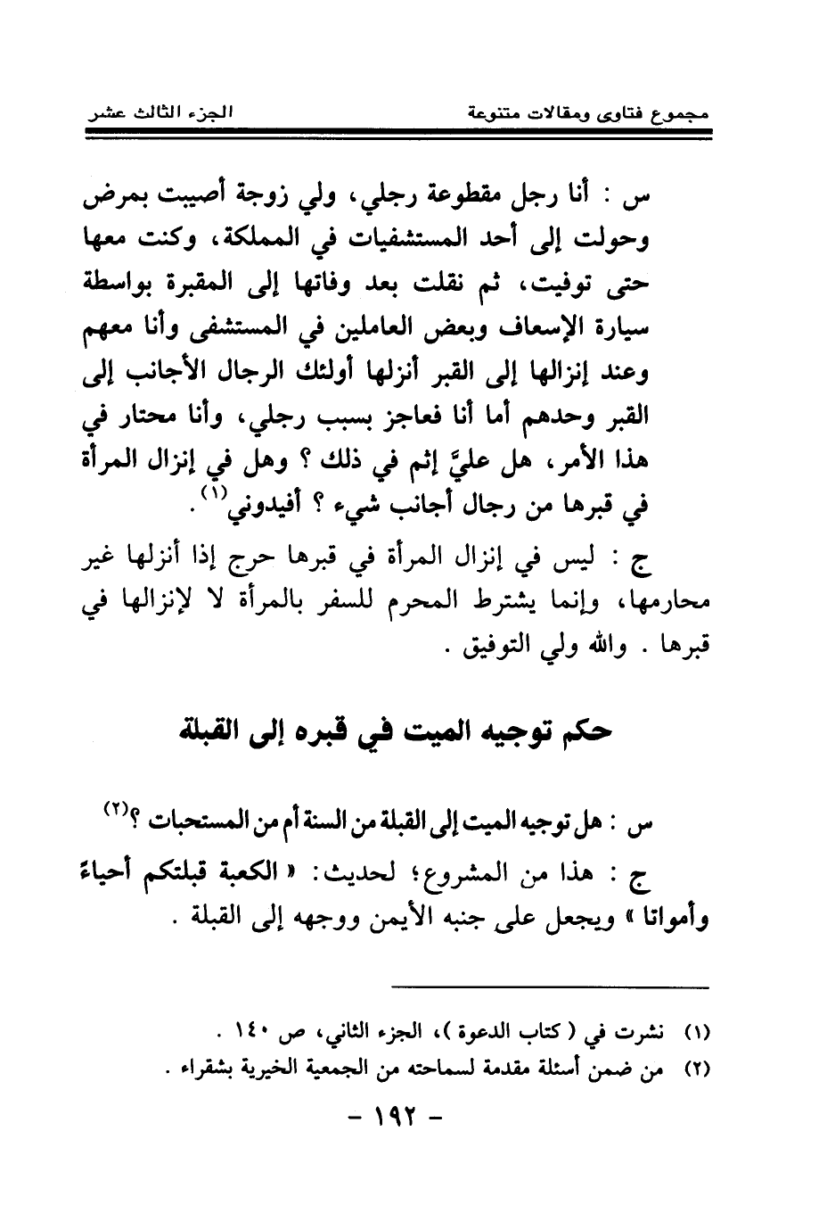 س: أنا رجل مقطوعة رجلي، ولي زوجة أصيبت بمرض وحولت إلى أحد المستشفيات في المملكة، وكنت معها حتى توفيت، ثم نقلت بعد وفاتها إلى المقبرة بواسطة سيارة الإسعاف وبعض العاملين في المستشفى وأنا معهم، وعند إنزالها إلى القبر أنزلها أولئك الرجال الأجانب إلى القبر وحدهم أما أنا فعاجز بسبب رجلي، وأنا محتار في هذا الأمر، هل علي إثم في ذلك؟ وهل في إنزال المرأة في قبرها من رجال أجانب شيء؟ أفيدوني. (¬1) .