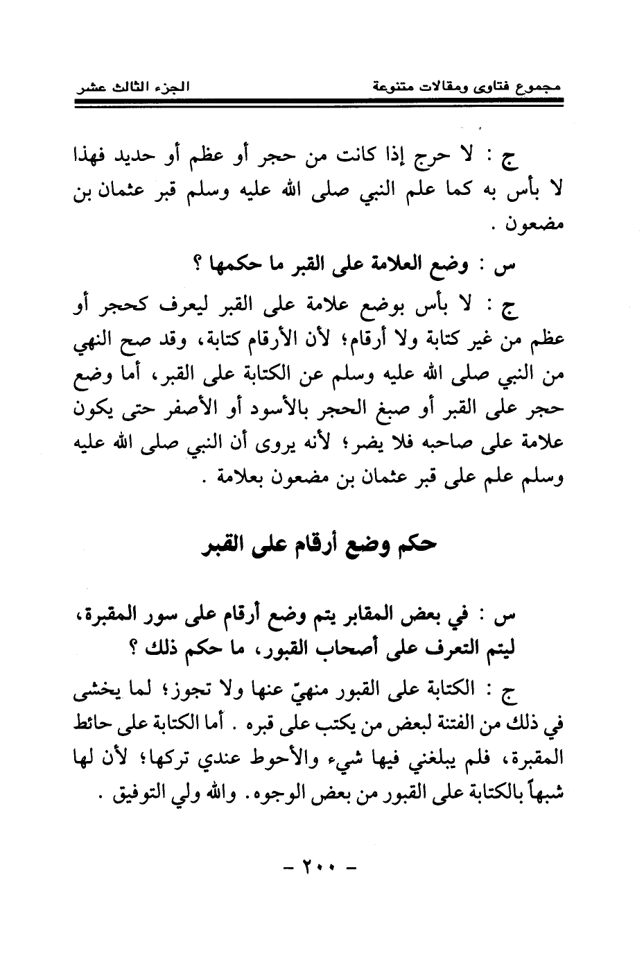 ج: لا بأس بوضع علامة على القبر ليعرف كحجر أو عظم من غير كتابة ولا أرقام؛ لأن الأرقام كتابة، وقد صح النهي من النبي صلى الله عليه وسلم عن الكتابة على القبر، أما وضع حجر على القبر أو صبغ الحجر بالأسود أو الأصفر حتى يكون علامة على صاحبه فلا يضر؛ لأنه يروى أن النبي صلى الله عليه وسلم علم على قبر عثمان بن مظعون بعلامة.
