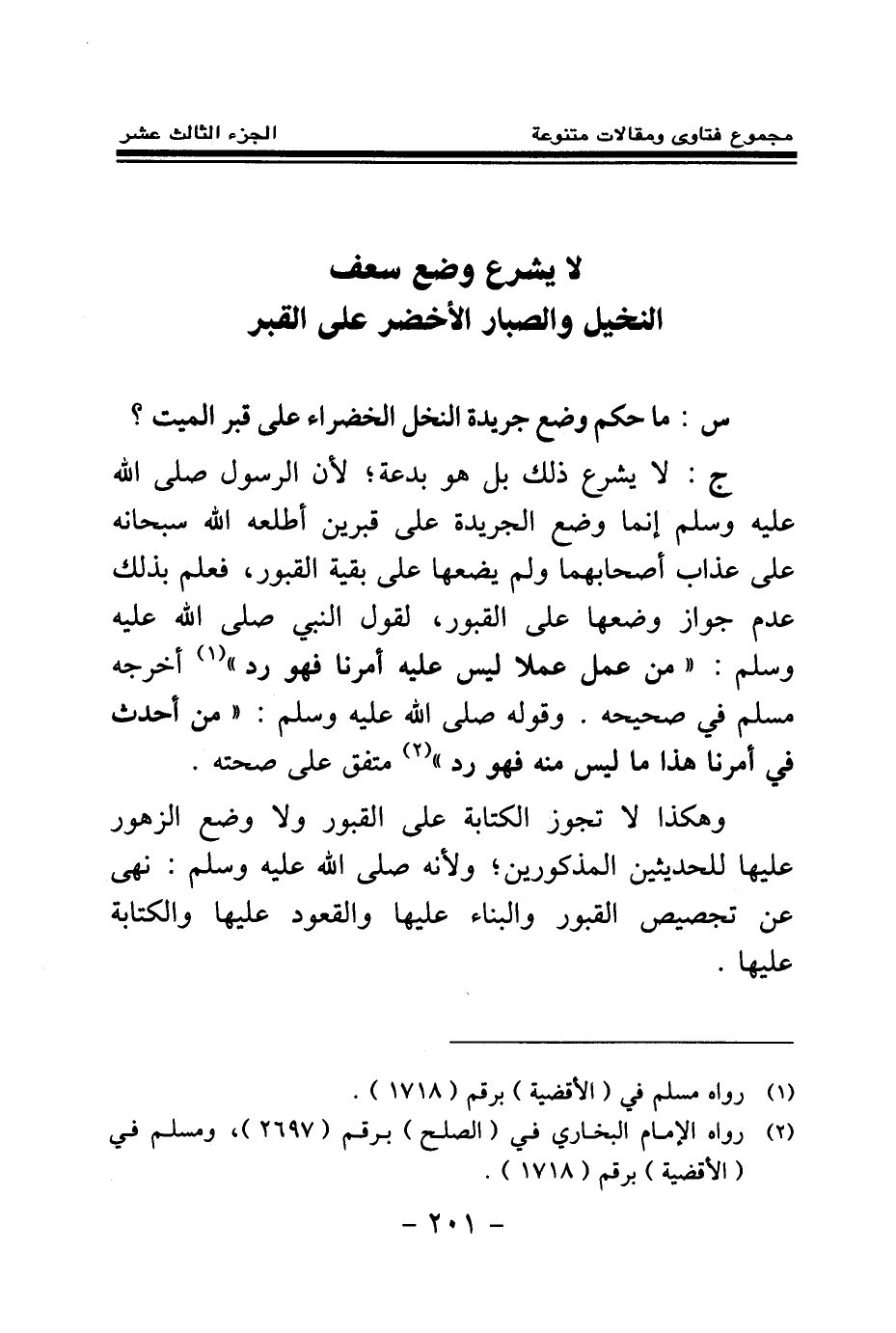 ج: لا يشرع ذلك بل هو بدعة؛ لأن الرسول صلى الله عليه وسلم إنما وضع الجريدة على قبرين أطلعه الله سبحانه على عذاب أصحابهما، ولم يضعها على بقية القبور، فعلم بذلك عدم جواز وضعها على القبور، لقول النبي صلى الله عليه وسلم: «من عمل عملا ليس عليه أمرنا فهو رد (¬1) » ، أخرجه مسلم في صحيحه.