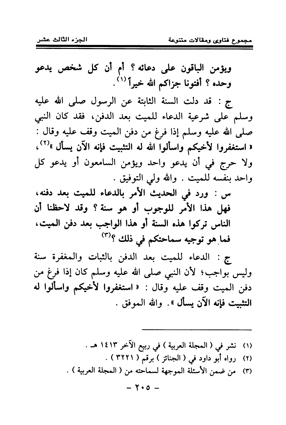 ج: الدعاء للميت بعد الدفن بالثبات والمغفرة سنة وليس بواجب؛ «لأن النبي صلى الله عليه وسلم كان إذا فرغ من دفن الميت وقف عليه، وقال: استغفروا لأخيكم واسألوا له التثبيت فإنه الآن يسأل (¬2) » ، والله الموفق.