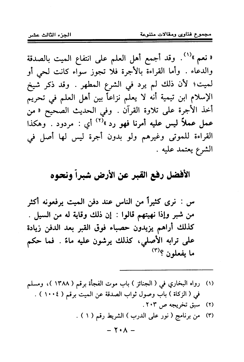 نعم (¬1) » ، وقد أجمع أهل العلم على انتفاع الميت بالصدقة والدعاء، وأما القراءة بالأجرة فلا تجوز سواء كانت لحي أو لميت؛ لأن ذلك لم يرد في الشرع المطهر، وقد ذكر شيخ الإسلام ابن تيمية أنه لا يعلم نزاعا بين أهل العلم في تحريم أخذ الأجرة على تلاوة القرآن.