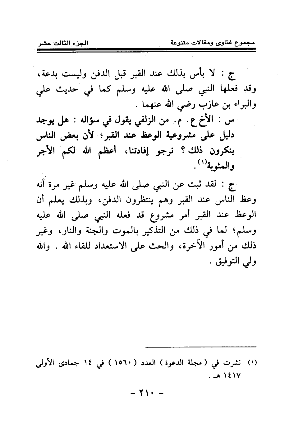 س: الأخ ع. م. من الزلفي يقول في سؤاله: هل يوجد دليل على مشروعية الوعظ عند القبر؛ لأن بعض الناس ينكرون ذلك؟ نرجو إفادتنا، أعظم الله لكم الأجر والمثوبة (¬1) . .