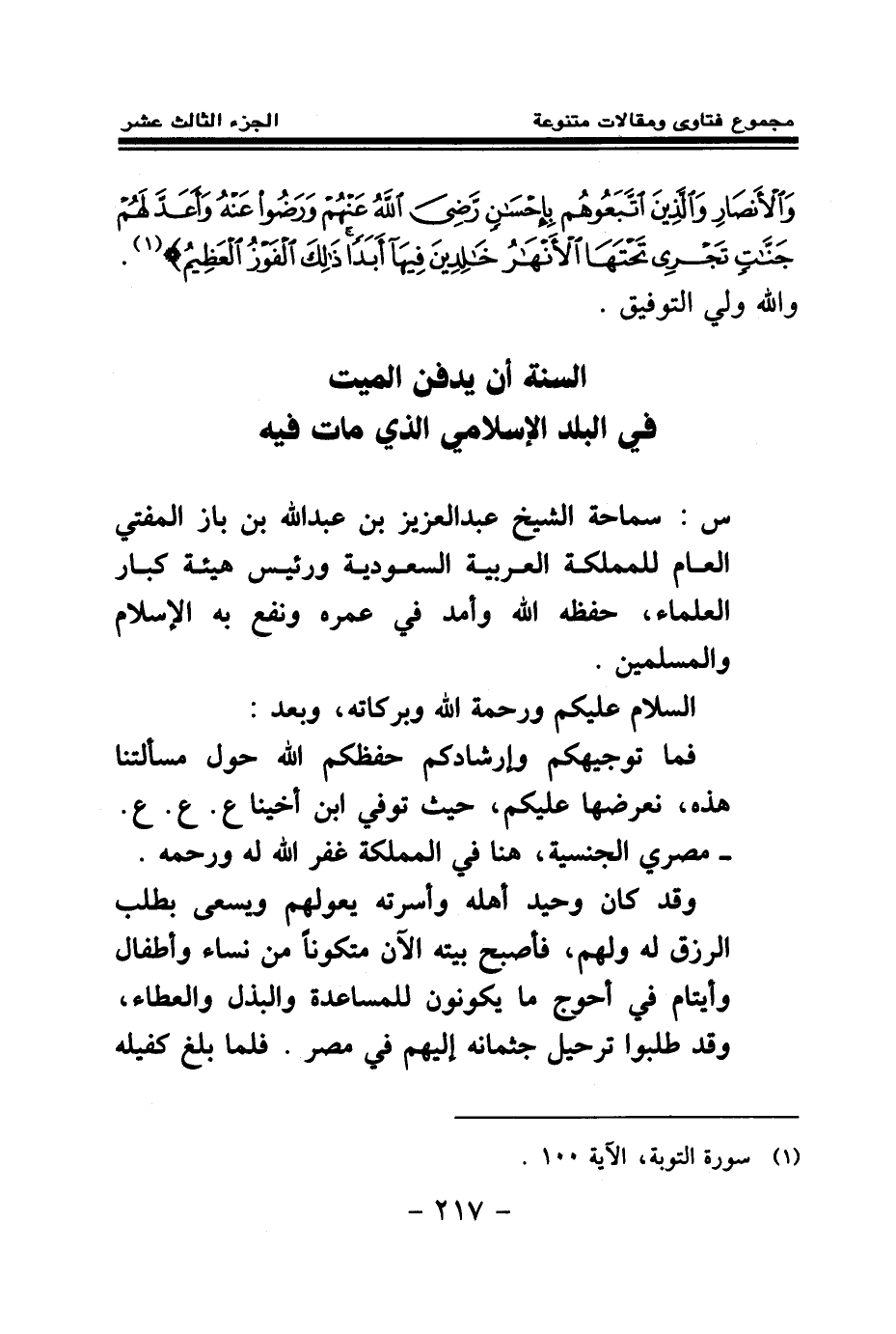 س: سماحة الشيخ عبد العزيز بن عبد الله بن باز المفتي العام للمملكة العربية السعودية ورئيس هيئة كبار العلماء، حفظه الله وأمد في عمره ونفع به الإسلام والمسلمين. السلام عليكم ورحمة الله وبركاته، وبعد: فما توجيهكم وإرشادكم حفظكم الله حول مسألتنا هذه، نعرضها عليكم، حيث توفي ابن أخينا ع. ع. ع. - مصري الجنسية، هنا في المملكة غفر الله له ورحمه. وقد كان وحيد أهله وأسرته يعولهم ويسعى بطلب الرزق له ولهم، فأصبح بيته الآن متكونا من نساء وأطفال وأيتام في أحوج ما يكونون للمساعدة والبذل والعطاء، وقد طلبوا ترحيل جثمانه إليهم في مصر. فلما بلغ كفيله