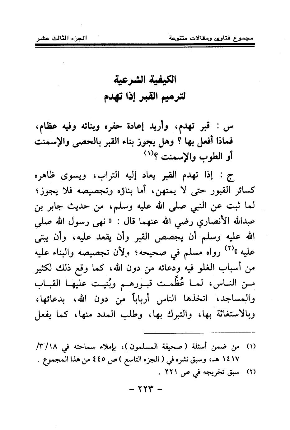 ج: إذا تهدم القبر يعاد إليه التراب، ويسوى ظاهره كسائر القبور حتى لا يمتهن، أما بناؤه وتجصيصه فلا يجوز؛ لما ثبت عن النبي صلى الله عليه وسلم، من حديث جابر بن عبد الله الأنصاري رضي الله عنهما قال: «نهى رسول الله صلى الله عليه وسلم أن يجصص القبر وأن يقعد عليه وأن يبنى عليه (¬1) » . . رواه مسلم في صحيحه؛ ولأن تجصيصه والبناء عليه من أسباب الغلو فيه ودعائه من دون الله، كما وقع ذلك لكثير من الناس، لما عظمت قبورهم وبنيت عليها القباب والمساجد، اتخذها الناس أربابا من دون الله، بدعائها، وبالاستغاثة بها، والتبرك بها، وطلب المدد منها، كما يفعل.