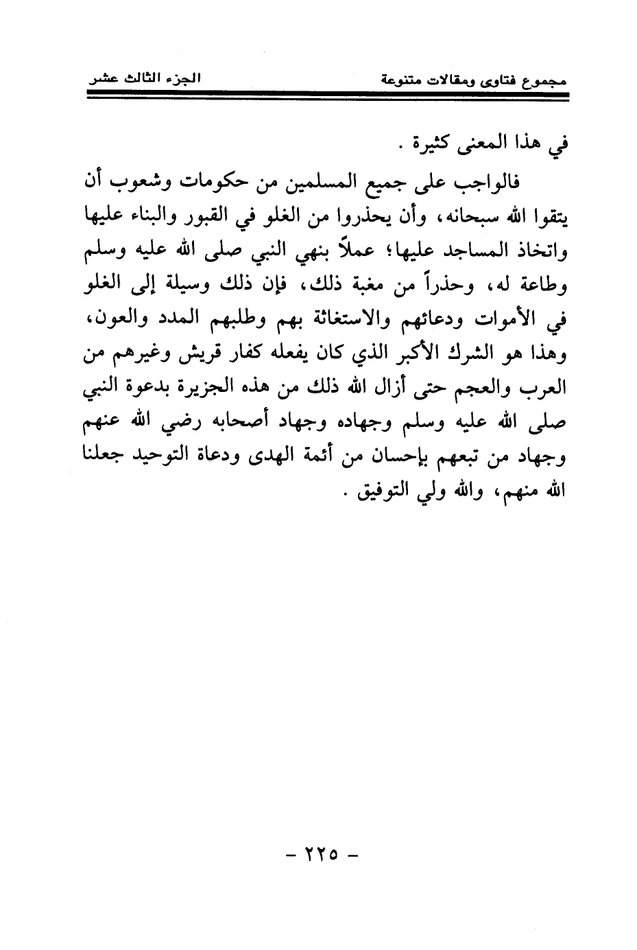 في هذا المعنى كثيرة. فالواجب على جميع المسلمين من حكومات وشعوب أن يتقوا الله سبحانه، وأن يحذروا من الغلو في القبور والبناء عليها واتخاذ المساجد عليها؛ عملا بنهي النبي صلى الله عليه وسلم وطاعة له، وحذرا من مغبة ذلك، فإن ذلك وسيلة إلى الغلو في الأموات ودعائهم والاستغاثة بهم وطلبهم المدد والعون، وهذا هو الشرك الأكبر الذي كان يفعله كفار قريش وغيرهم من العرب والعجم حتى أزال الله ذلك من هذه الجزيرة بدعوة النبي صلى الله عليه وسلم وجهاده وجهاد أصحابه رضي الله عنهم وجهاد من تبعهم بإحسان من أئمة الهدى ودعاة التوحيد جعلنا الله منهم، والله ولي التوفيق.
