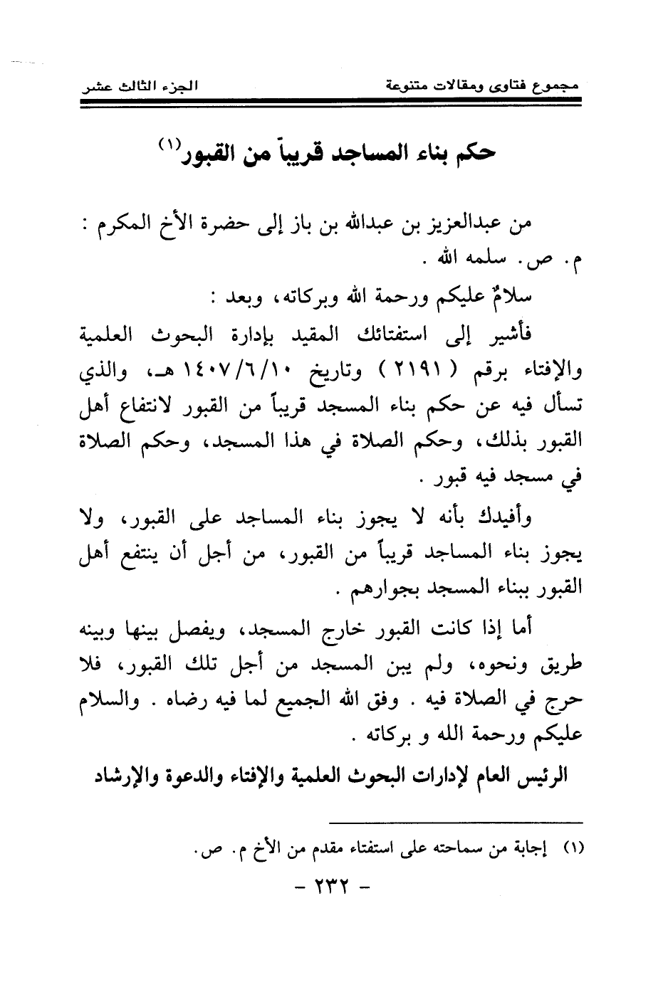من عبد العزيز بن عبد الله بن باز إلى حضرة الأخ المكرم: م. ص. سلمه الله. سلام عليكم ورحمة الله وبركاته، وبعد: فأشير إلى استفتائك المقيد بإدارة البحوث العلمية والإفتاء برقم (2191) وتاريخ10 \ 6 \ 1407 هـ، والذي تسأل فيه عن حكم بناء المسجد قريبا من القبور لانتفاع أهل القبور بذلك، وحكم الصلاة في هذا المسجد، وحكم الصلاة في مسجد فيه قبور؟ وأفيدك بأنه لا يجوز بناء المساجد على القبور، ولا يجوز بناء المساجد قريبا من القبور، من أجل أن ينتفع أهل القبور ببناء المسجد بجوارهم. أما إذا كانت القبور خارج المسجد، ويفصل بينها وبينه طريق ونحوه، ولم يبن المسجد من أجل تلك القبور، فلا حرج في الصلاة فيه. وفق الله الجميع لما فيه رضاه. والسلام عليكم ورحمة الله وبركاته. الرئيس العام لإدارات البحوث العلمية والإفتاء والدعوة والإرشاد.