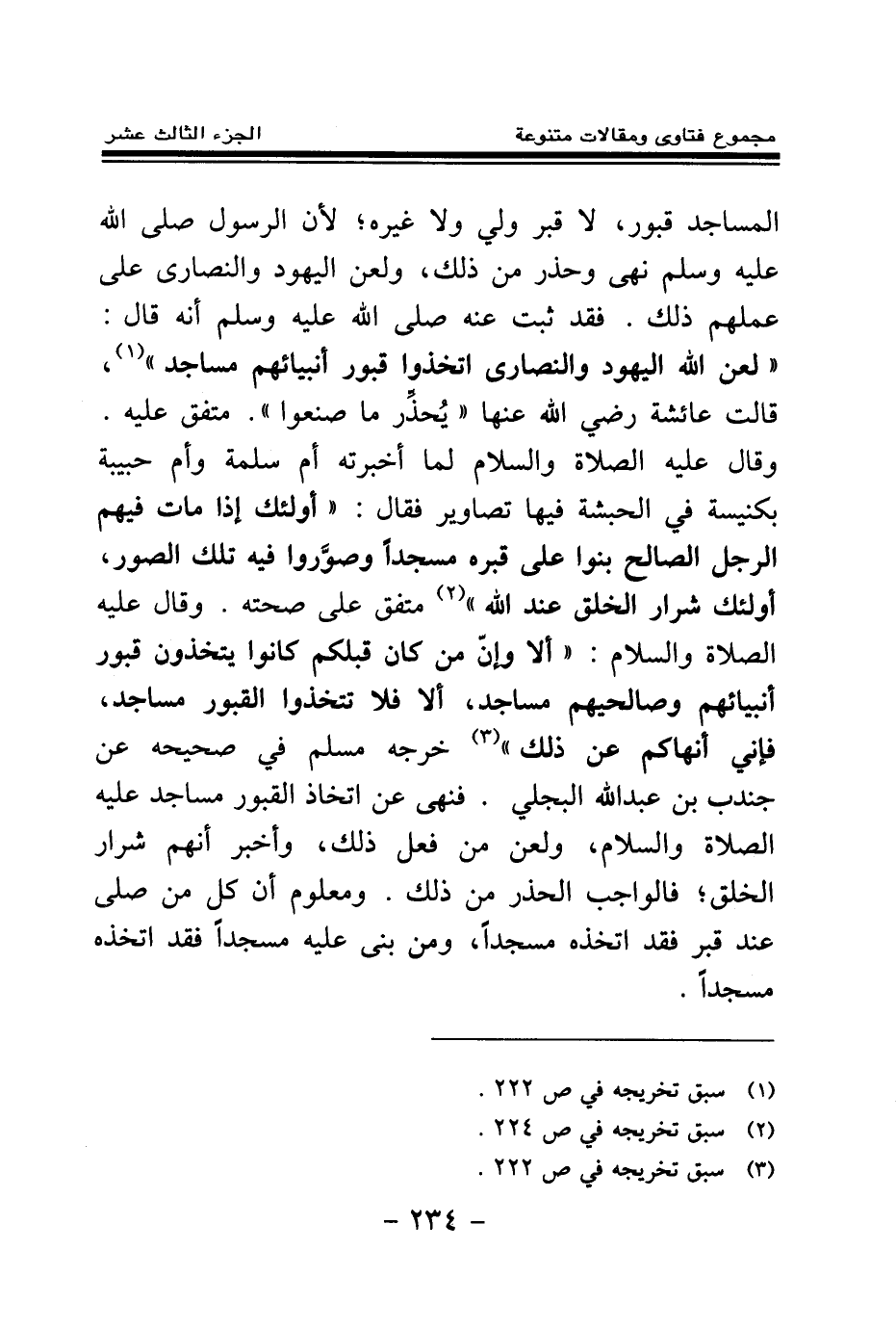 (¬3) رواه البخاري في (الجنائز) باب بناء المسجد على القبر برقم (1341) واللفظ له، ومسلم في (المساجد ومواضع الصلاة) باب النهي عن بناء المساجد على القبور برقم (528) ، والنسائي في (المساجد) باب النهي عن اتخاذ المساجد على القبور برقم (704)