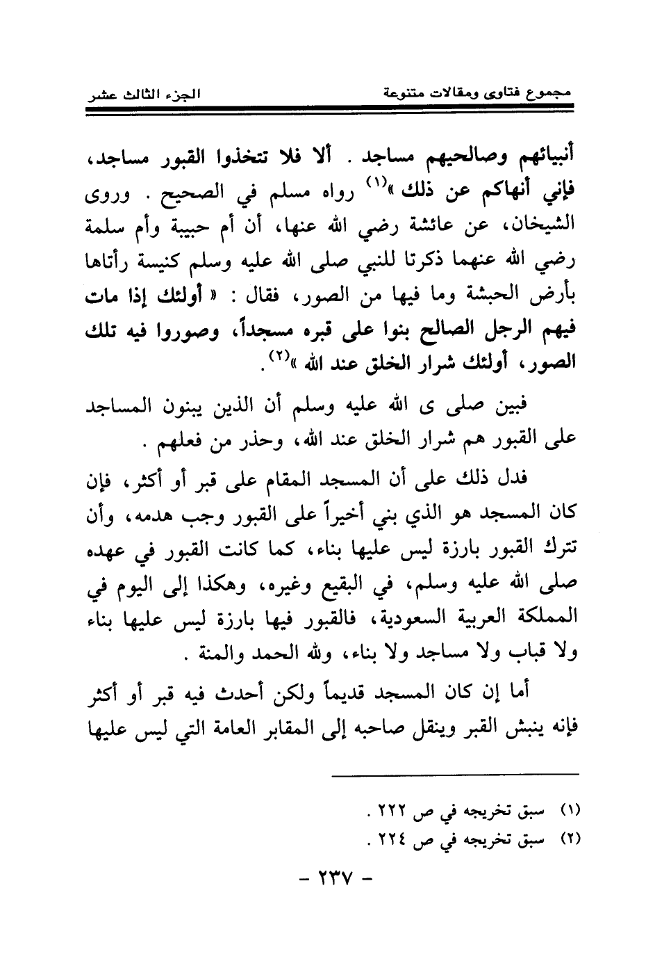 أنبيائهم وصالحيهم مساجد ألا فلا تتخذوا القبور مساجد فإني أنهاكم عن ذلك (¬1) » . رواه مسلم في الصحيح. وروى الشيخان، عن عائشة رضي الله عنها، «أن أم حبيبة وأم سلمة رضي الله عنهما ذكرتا للنبي صلى الله عليه وسلم كنيسة رأتاها بأرض الحبشة وما فيها من الصور، فقال: أولئك إذا مات فيهم الرجل الصالح بنوا على قبره مسجدا وصوروا فيه تلك الصور أولئك شرار الخلق عند الله (¬2) » فبين صلى الله عليه وسلم أن الذين يبنون المساجد على القبور هم شرار الخلق عند الله، وحذر من فعلهم. فدل ذلك على أن المسجد المقام على قبر أو أكثر، فإن كان المسجد هو الذي بني أخيرا على القبور وجب هدمه، وأن تترك القبور بارزة ليس عليها بناء، كما كانت القبور في عهده صلى الله عليه وسلم، في البقيع وغيره، وهكذا إلى اليوم في المملكة العربية السعودية، فالقبور فيها بارزة ليس عليها بناء ولا قباب ولا مساجد ولا بناء، ولله الحمد والمنة. أما إن كان المسجد قديما ولكن أحدث فيه قبر أو أكثر فإنه ينبش القبر وينقل صاحبه إلى المقابر العامة التي ليس عليها