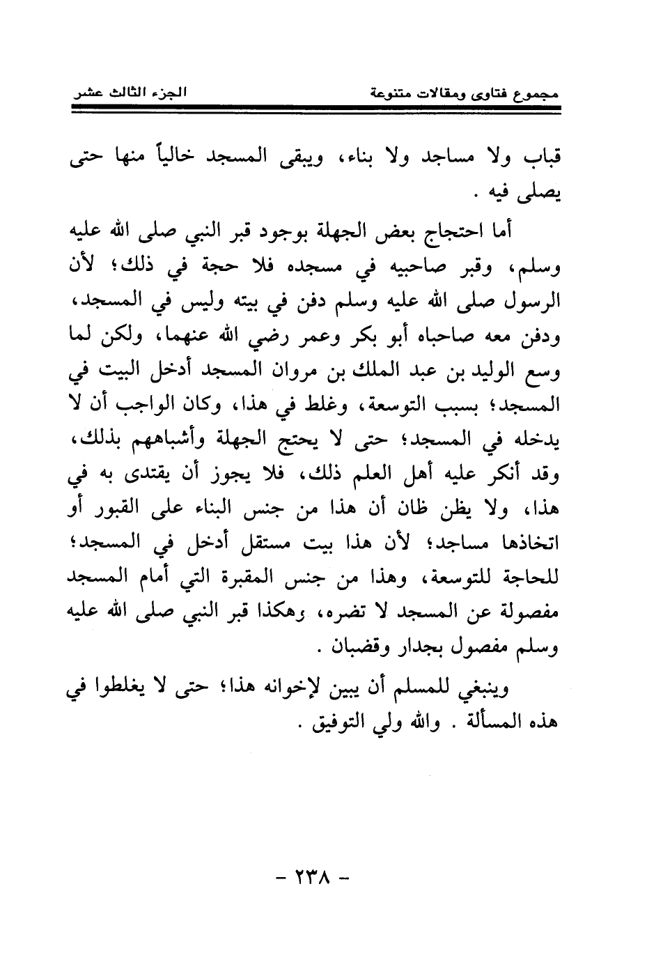 قباب ولا مساجد ولا بناء، ويبقى المسجد خاليا منها حتى يصلى فيه. أما احتجاج بعض الجهلة بوجود قبر النبي صلى الله عليه وسلم، وقبر صاحبيه في مسجده فلا حجة في ذلك؛ لأن الرسول صلى الله عليه وسلم دفن في بيته وليس في المسجد، ودفن معه صاحباه أبو بكر وعمر رضي الله عنهما، ولكن لما وسع الوليد بن عبد الملك بن مروان المسجد أدخل البيت في المسجد؛ بسبب التوسعة، وغلط في هذا، وكان الواجب أن لا يدخله في المسجد؛ حتى لا يحتج الجهلة وأشباههم بذلك، وقد أنكر عليه أهل العلم ذلك، فلا يجوز أن يقتدى به في هذا، ولا يظن ظان أن هذا من جنس البناء على القبور أو اتخاذها مساجد؛ لأن هذا بيت مستقل أدخل في المسجد؛ للحاجة للتوسعة، وهذا من جنس المقبرة التي أمام المسجد مفصولة عن المسجد لا تضره، وهكذا قبر النبي صلى الله عليه وسلم مفصول بجدار وقضبان. وينبغي للمسلم أن يبين لإخوانه هذا؛ حتى لا يغلطوا في هذه المسألة. والله ولي التوفيق.