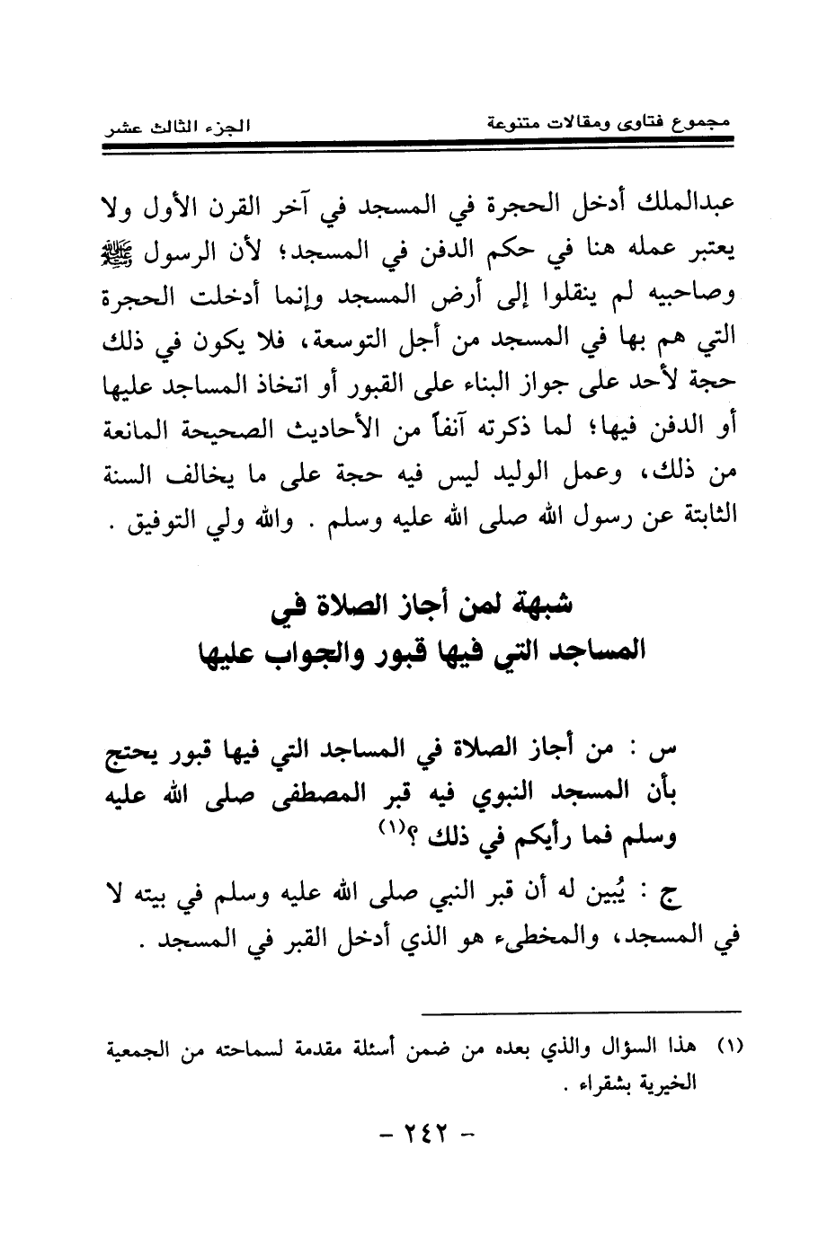 س: من أجاز الصلاة في المساجد التي فيها قبور يحتج بأن المسجد النبوي فيه قبر المصطفى صلى الله عليه وسلم فما رأيكم في ذلك؟ (¬1)