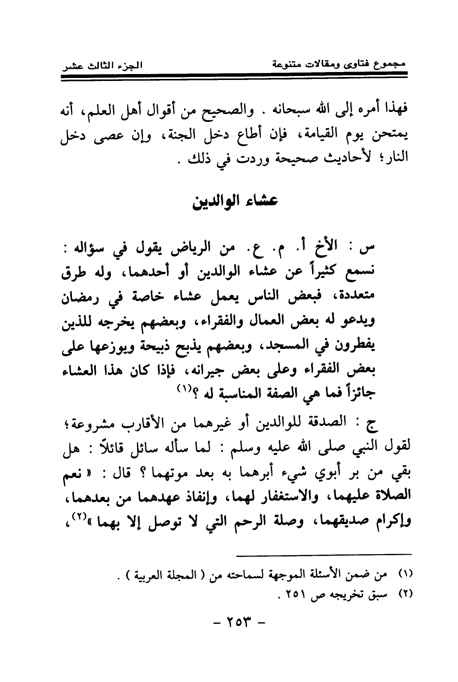 س: الأخ أ. م. ع. من الرياض يقول في سؤاله: نسمع كثيرا عن عشاء الوالدين أو أحدهما، وله طرق متعددة، فبعض الناس يعمل عشاء خاصة في رمضان ويدعو له بعض العمال والفقراء، وبعضهم يخرجه للذين يفطرون في المسجد، وبعضهم يذبح ذبيحة ويوزعها على بعض الفقراء وعلى بعض جيرانه، فإذا كان هذا العشاء جائزا فما هي الصفة المناسبة له؟ (¬1)