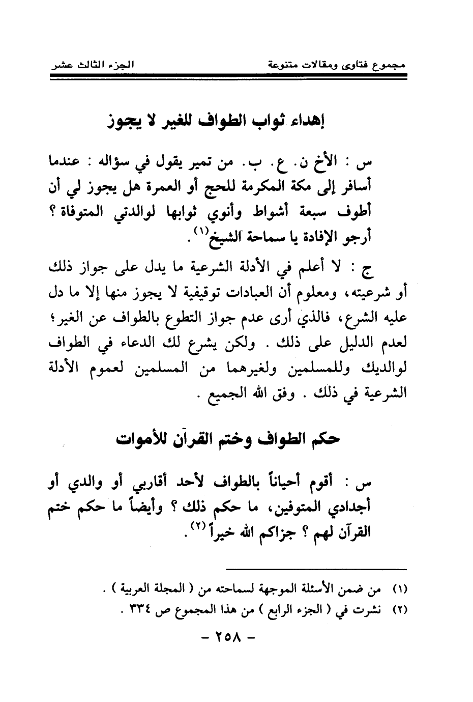 س: الأخ ن. ع. ب. من تمير يقول في سؤاله: عندما أسافر إلى مكة المكرمة للحج أو العمرة هل يجوز لي أن أطوف سبعة أشواط وأنوي ثوابها لوالدتي المتوفاة؟ أرجو الإفادة يا سماحة الشيخ (¬1) .