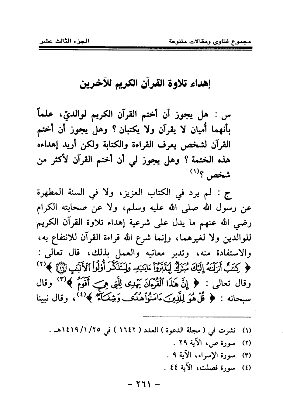 ج: لم يرد في الكتاب العزيز، ولا في السنة المطهرة عن رسول الله صلى الله عليه وسلم، ولا عن صحابته الكرام رضي الله عنهم ما يدل على شرعية إهداء تلاوة القرآن الكريم للوالدين ولا لغيرهما، وإنما شرع الله قراءة القرآن للانتفاع به، والاستفادة منه، وتدبر معانيه والعمل بذلك، قال تعالى: {كِتَابٌ أَنْزَلْنَاهُ إِلَيْكَ مُبَارَكٌ لِيَدَّبَّرُوا آيَاتِهِ وَلِيَتَذَكَّرَ أُولُو الْأَلْبَابِ} (¬2) وقال تعالى: {إِنَّ هَذَا الْقُرْآنَ يَهْدِي لِلَّتِي هِيَ أَقْوَمُ} (¬3) وقال سبحانه: {قُلْ هُوَ لِلَّذِينَ آمَنُوا هُدًى وَشِفَاءٌ} (¬4) وقال نبينا