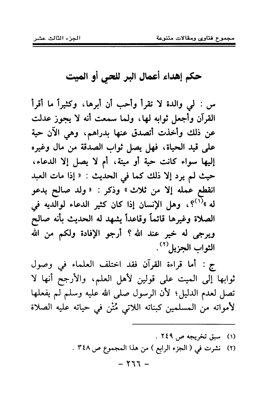 س: لي والدة لا تقرأ وأحب أن أبرها، وكثيرا ما أقرأ القرآن وأجعل ثوابه لها، ولما سمعت أنه لا يجوز عدلت عن ذلك وأخذت أتصدق عنها بدراهم، وهي الآن حية على قيد الحياة، فهل يصل ثواب الصدقة من مال وغيره إليها سواء كانت حيه أو ميتة، أم لا يصل إلا الدعاء، حيث لم يرد إلا ذلك كما في الحديث: «إذا مات العبد انقطع عمله إلا من ثلاث (¬1) » وذكر: «ولد صالح يدعو له (¬2) » ؟ وهل الإنسان إذا كان كثير الدعاء لوالديه في الصلاة وغيرها قائما وقاعدا يشهد له الحديث بأنه صالح ويرجى له خير عند الله؟ أرجو الإفادة ولكم من الله الثواب الجزيل (¬3) .