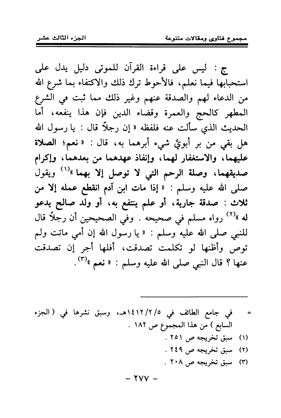 ج: ليس على قراءة القرآن للموتى دليل يدل على استحبابها فيما نعلم، فالأحوط ترك ذلك والاكتفاء بما شرع الله من الدعاء لهم والصدقة عنهم وغير ذلك مما ثبت في الشرع المطهر كالحج والعمرة وقضاء الدين فإن هذا ينفعه، أما الحديث الذي سألت عنه فلفظه «إن رجلا قال يا رسول الله هل بقي من بر أبوي شيء أبرهما به قال نعم الصلاة عليهما والاستغفار لهما وإنفاذ عهدهما من بعدهما وإكرام صديقهما وصلة الرحم التي لا توصل إلا بهما (¬1) » والله ولي التوفيق. ويقول صلى الله عليه وسلم: «إذا مات ابن آدم انقطع عمله إلا من ثلاث صدقة جارية أو علم ينتفع به أو ولد صالح يدعو له (¬2) » رواه مسلم في صحيحه.