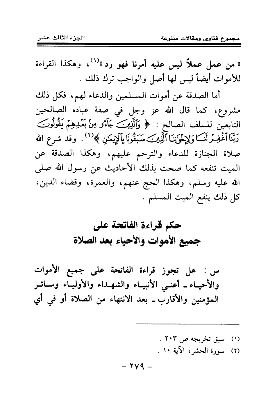 أما الصدقة عن أموات المسلمين والدعاء لهم، فكل ذلك مشروع، كما قال الله عز وجل في صفة عباده الصالحين التابعين للسلف الصالح: {وَالَّذِينَ جَاءُوا مِنْ بَعْدِهِمْ يَقُولُونَ رَبَّنَا اغْفِرْ لَنَا وَلِإِخْوَانِنَا الَّذِينَ سَبَقُونَا بِالْإِيمَانِ} (¬2) وقد شرع الله صلاة الجنازة للدعاء والترحم عليهم، وهكذا الصدقة عن الميت تنفعه كما صحت بذلك الأحاديث عن رسول الله صلى الله عليه وسلم، وهكذا الحج عنهم، والعمرة، وقضاء الدين، كل ذلك ينفع الميت المسلم.