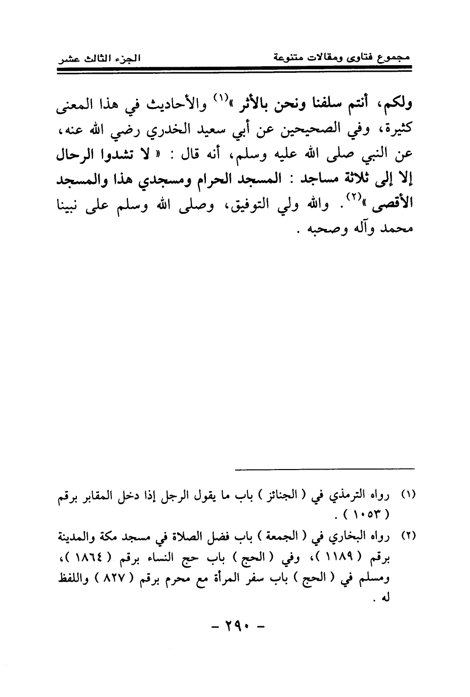 ولكم أنتم سلفنا ونحن بالأثر (¬1) » والأحاديث في هذا المعنى كثيرة، وفي الصحيحين عن أبي سعيد الخدري رضي الله عنه، عن النبي صلى الله عليه وسلم، أنه قال: «لا تشدوا الرحال إلا إلى ثلاثة مساجد المسجد الحرام ومسجدي هذا والمسجد الأقصى (¬2) » والله ولي التوفيق، وصلى الله وسلم على نبينا محمد وآله وصحبه.