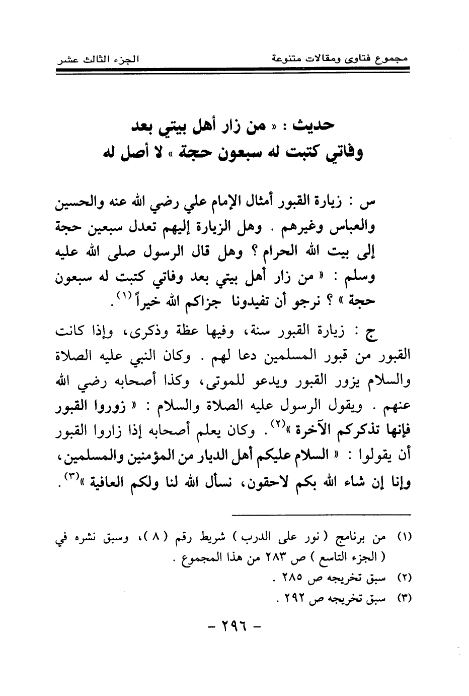 س: زيارة القبور أمثال الإمام علي رضي الله عنه والحسين والعباس وغيرهم. وهل الزيارة إليهم تعدل سبعين حجة إلى بيت الله الحرام؟ وهل قال الرسول صلى الله عليه وسلم: من زار أهل بيتي بعد وفاتي كتبت له سبعون حجة؟ نرجوا أن تفيدونا جزاكم الله خيرا (¬1) .
