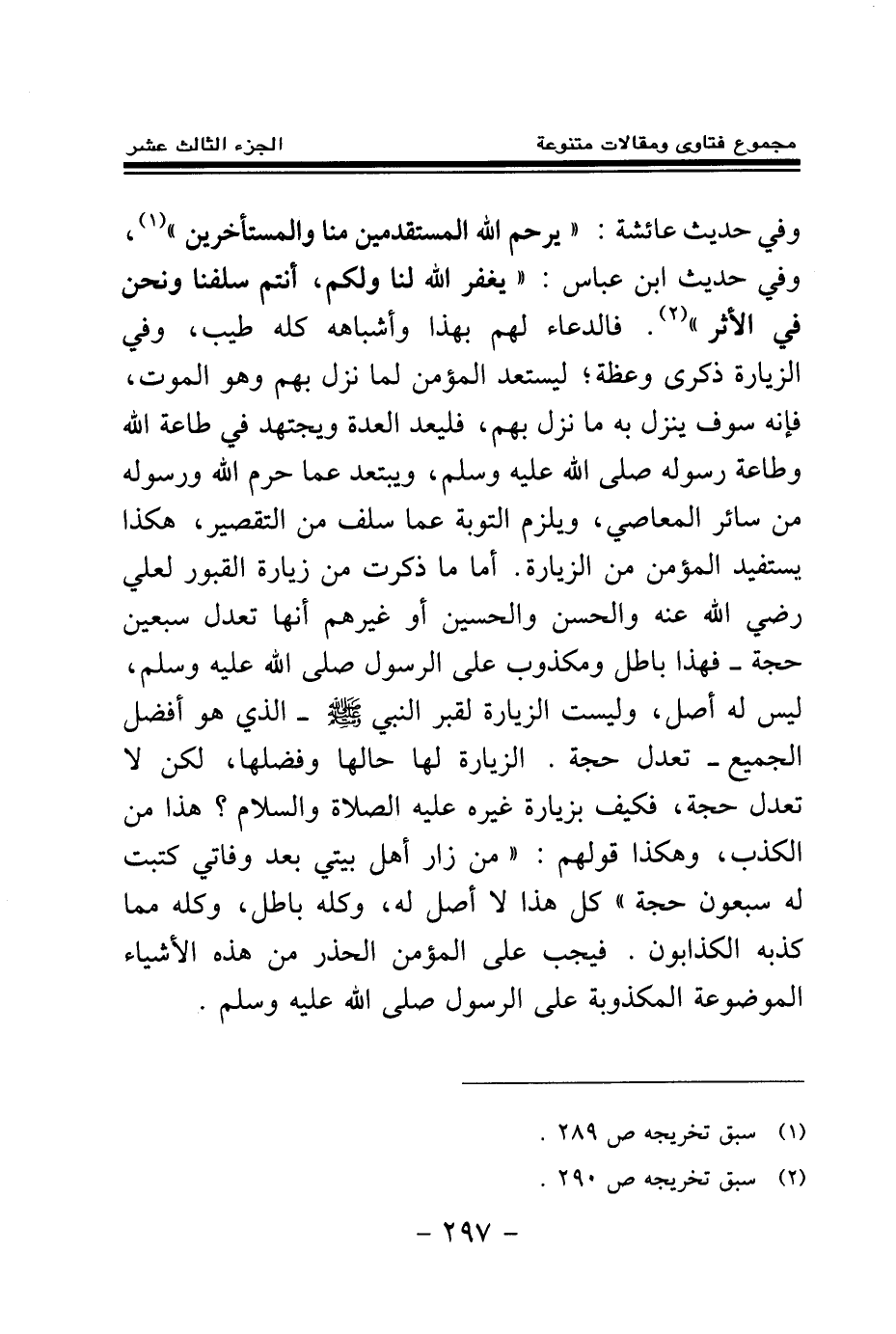 وفي حديث عائشة: «يرحم الله المستقدمين منا والمستأخرين (¬1) » وفي حديث ابن عباس: «يغفر الله لنا ولكم أنتم سلفنا ونحن في الأثر (¬2) » فالدعاء لهم بهذا وأشباهه كله طيب، وفي الزيارة ذكرى وعظة؛ ليستعد المؤمن لما نزل بهم وهو الموت، فإنه سوف ينزل به ما نزل بهم، فليعد العدة ويجتهد في طاعة الله وطاعة رسوله صلى الله عليه وسلم، ويبتعد عما حرم الله ورسوله من سائر المعاصي، ويلزم التوبة عما سلف من التقصير، هكذا يستفيد المؤمن من الزيارة. أما ما ذكرت من زيارة القبور لعلي رضي الله عنه والحسن والحسين أو غيرهم أنها تعدل سبعين حجة - فهذا باطل ومكذوب على الرسول صلى الله عليه وسلم، ليس له أصل، وليست الزيارة لقبر النبي صلى الله عليه وسلم- الذي هو أفضل الجميع- تعدل حجة. الزيارة لها حالها وفضلها، لكن لا تعدل حجة، فكيف بزيارة غيره عليه الصلاة والسلام؟ هذا من الكذب، وهكذا قولهم: من زار أهل بيتي بعد وفاتي كتبت له سبعون حجة كل هذا لا أصل له، وكله باطل، وكله مما كذبه الكذابون. فيجب على المؤمن الحذر من هذه الأشياء الموضوعة المكذوبة على الرسول صلى الله عليه وسلم.