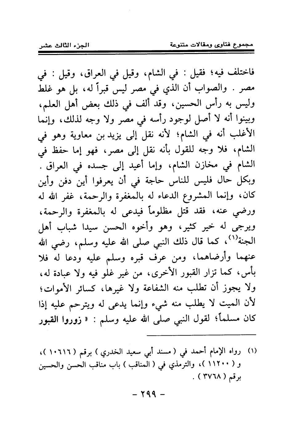 فاختلف فيه؛ فقيل: في الشام، وقيل في العراق، وقيل: في مصر. والصواب أن الذي في مصر ليس قبرا له، بل هو غلط وليس به رأس الحسين، وقد ألف في ذلك بعض أهل العلم، وبينوا أنه لا أصل لوجود رأسه في مصر ولا وجه لذلك، وإنما الأغلب أنه في الشام؛ لأنه نقل إلى يزيد بن معاوية وهو في الشام، فلا وجه للقول بأنه نقل إلى مصر، فهو إما حفظ في الشام في مخازن الشام، وإما أعيد إلى جسده في العراق. وبكل حال فليس للناس حاجة في أن يعرفوا أين دفن وأين كان، وإنما المشروع الدعاء له بالمغفرة والرحمة، غفر الله له ورضي عنه، فقد قتل مظلوما فيدعى له بالمغفرة والرحمة، ويرجى له خير كثير، وهو وأخوه الحسن سيدا شباب أهل الجنة، كما قال ذلك النبي صلى الله عليه وسلم، رضي الله عنهما وأرضاهما، ومن عرف قبره وسلم عليه ودعا له فلا بأس، كما تزار القبور الأخرى، من غير غلو فيه ولا عبادة له، ولا يجوز أن تطلب منه الشفاعة ولا غيرها، كسائر الأموات؛ لأن الميت لا يطلب منه شيء وإنما يدعى له ويترحم عليه إذا كان مسلما؛ لقول النبي صلى الله عليه وسلم: «زوروا القبور