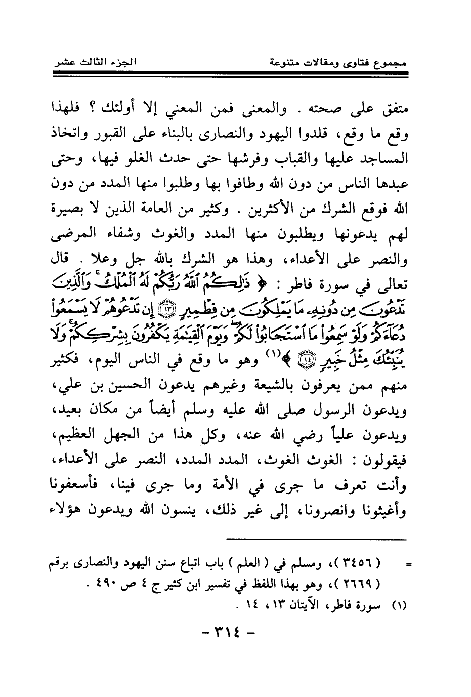قال تعالى في سورة فاطر: {ذَلِكُمُ اللَّهُ رَبُّكُمْ لَهُ الْمُلْكُ وَالَّذِينَ تَدْعُونَ مِنْ دُونِهِ مَا يَمْلِكُونَ مِنْ قِطْمِيرٍ} (¬1) {إِنْ تَدْعُوهُمْ لَا يَسْمَعُوا دُعَاءَكُمْ وَلَوْ سَمِعُوا مَا اسْتَجَابُوا لَكُمْ وَيَوْمَ الْقِيَامَةِ يَكْفُرُونَ بِشِرْكِكُمْ وَلَا يُنَبِّئُكَ مِثْلُ خَبِيرٍ} (¬2) وهو ما وقع في الناس اليوم، فكثير منهم ممن يعرفون بالشيعة وغيرهم يدعون الحسين بن علي، ويدعون الرسول صلى الله عليه وسلم أيضا من مكان بعيد، ويدعون عليا رضي الله عنه، وكل هذا من الجهل العظيم، فيقولون: الغوث الغوث، المدد المدد، النصر على الأعداء، وأنت تعرف ما جرى في الأمة وما جرى فينا، فأسعفونا وأغيثونا وانصرونا، إلى غير ذلك، ينسون الله ويدعون هؤلاء