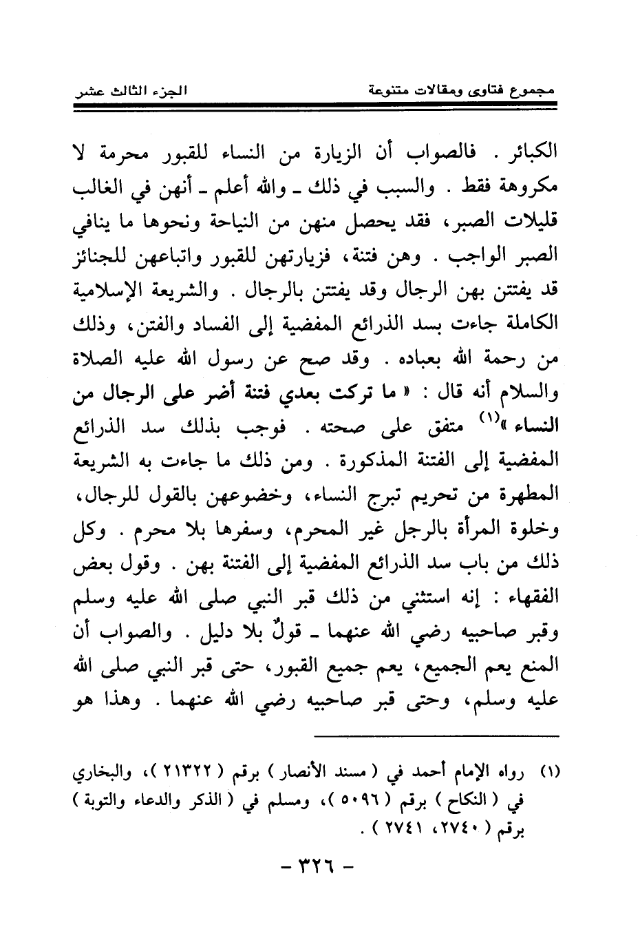 وقد صح عن رسول الله عليه الصلاة والسلام أنه قال: «ما تركت بعدي فتنة أضر على الرجال من النساء (¬1) » متفق على صحته. فوجب بذلك سد الذرائع المفضية إلى الفتنة المذكورة. ومن ذلك ما جاءت به الشريعة المطهرة من تحريم تبرج النساء، وخضوعهن بالقول للرجال، وخلوة المرأة بالرجل غير المحرم، وسفرها بلا محرم. وكل ذلك من باب سد الذرائع المفضية إلى الفتنة بهن. وقول بعض الفقهاء: إنه استثني من ذلك قبر النبي صلى الله عليه وسلم وقبر صاحبيه رضي الله عنهما- قول بلا دليل. والصواب أن المنع يعم الجميع، يعم جميع القبور، حتى قبر النبي صلى الله عليه وسلم، وحتى قبر صاحبيه رضي الله عنهما.