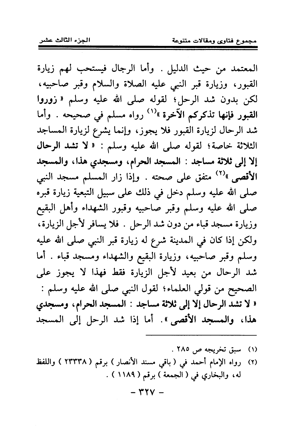 وأما شد الرحال لزيارة القبور فلا يجوز، وإنما يشرع لزيارة المساجد الثلاثة خاصة؛ لقوله صلى الله عليه وسلم: «لا تشد الرحال إلا إلى ثلاثة مساجد المسجد الحرام ومسجدي هذا والمسجد الأقصى (¬2) » متفق على صحته.