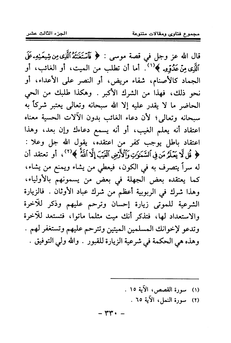 قال الله عز وجل في قصة موسى: {فَاسْتَغَاثَهُ الَّذِي مِنْ شِيعَتِهِ عَلَى الَّذِي مِنْ عَدُوِّهِ} (¬1) أما أن تطلب من الميت، أو الغائب، أو الجماد كالأصنام، شفاء مريض، أو النصر على الأعداء، أو نحو ذلك، فهذا من الشرك الأكبر. وهكذا طلبك من الحي الحاضر ما لا يقدر عليه إلا الله سبحانه وتعالى يعتبر شركا به سبحانه وتعالى؛ لأن دعاء الغائب بدون الآلات الحسية معناه اعتقاد أنه يعلم الغيب، أو أنه يسمع دعاءك وإن بعد، وهذا اعتقاد باطل يوجب كفر من اعتقده، يقول الله جل وعلا: {قُلْ لَا يَعْلَمُ مَنْ فِي السَّمَاوَاتِ وَالْأَرْضِ الْغَيْبَ إِلَّا اللَّهُ} (¬2) أو تعتقد أن له سرا يتصرف به في الكون، فيعطي من يشاء ويمنع من يشاء، كما يعتقده بعض الجهلة في بعض من يسمونهم بالأولياء، وهذا شرك في الربوبية أعظم من شرك عباد الأوثان.